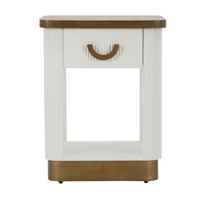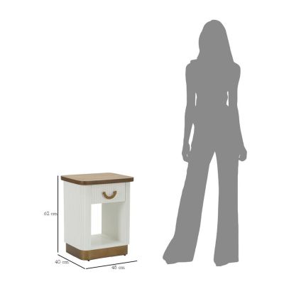 | Description | Bedside table in white wood with a rounded top and brown wood inserts. Finely decorated with relief lines. Complete with drawer and shelf. |