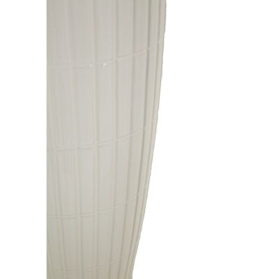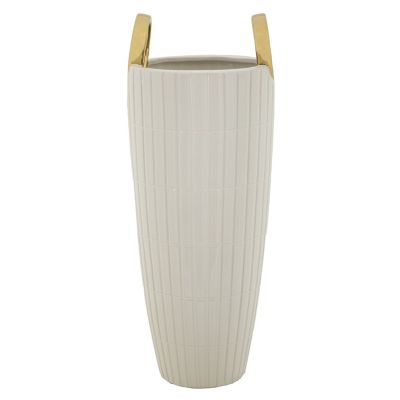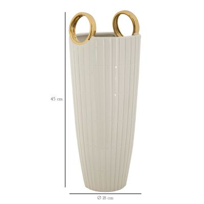 | Description | White ceramic vase with elegant raised squares, embellished with two golden rings. |