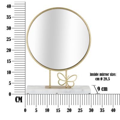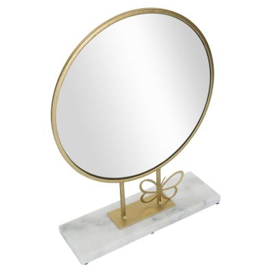 | Description | Round table mirror with gold metal frame and white marble base embellished with an elegant butterfly. |