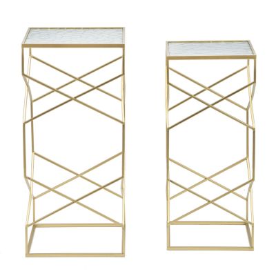 | Description | Pair of square gold metal side tables with geometric lines that create a sense of depth. Complete with finely crafted glass top. |