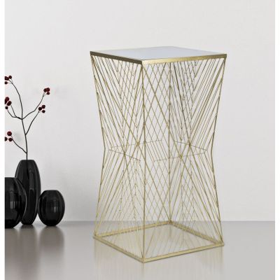 | Description | Square gold-colored metal telephone table with geometric lines that create a perfect weave. Complete with mirrored glass top. |