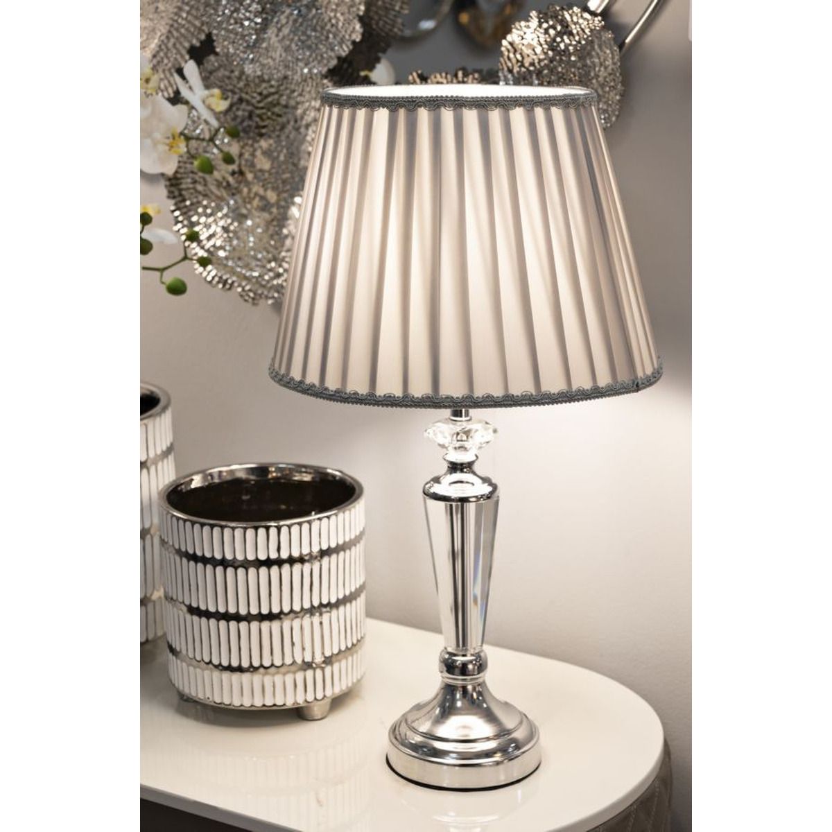 | Description | Elegant table lamp in silver metal and glass. Complete with gray fabric lampshade with dark gray trim. |