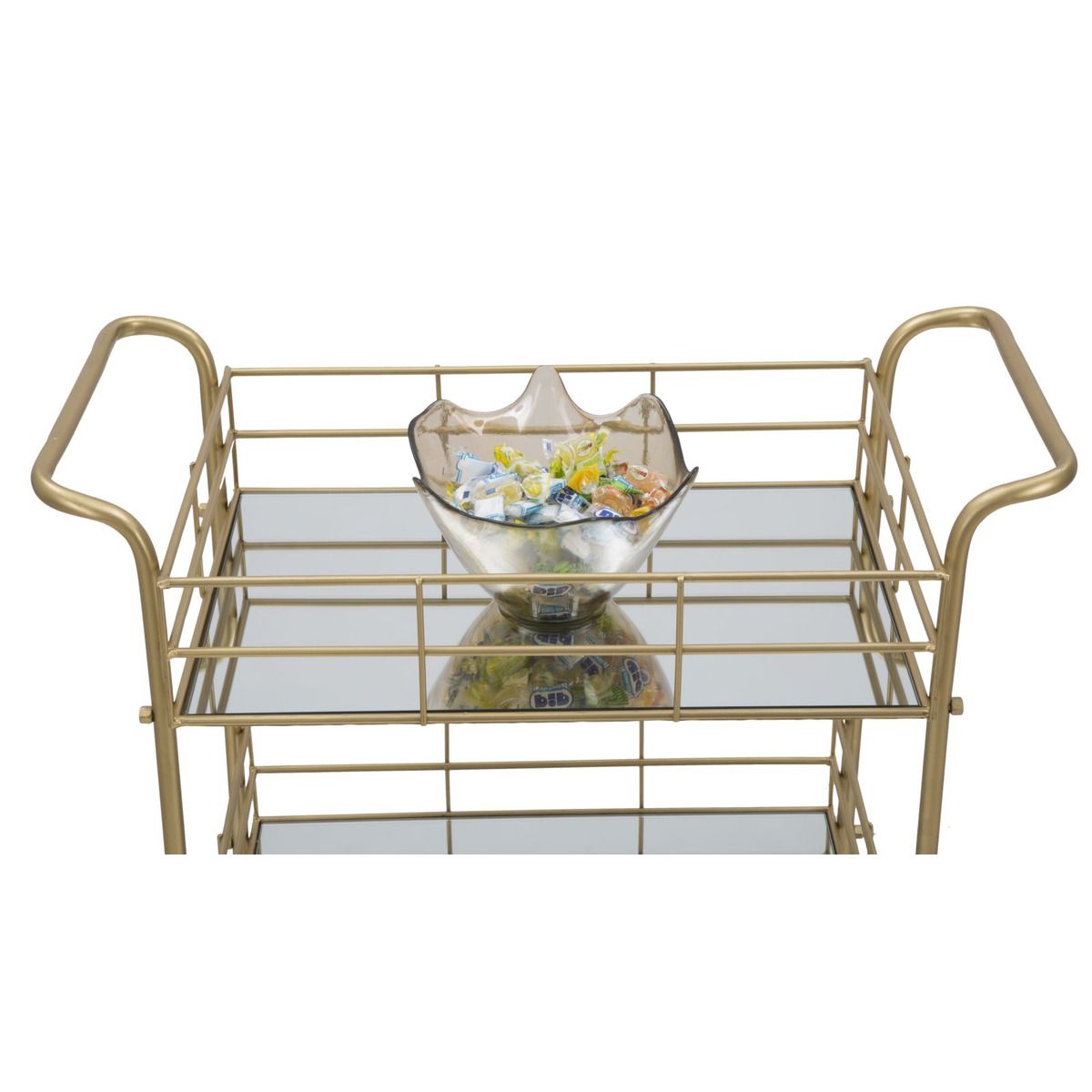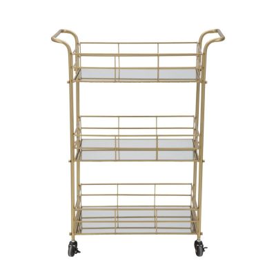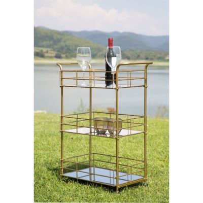 | Description | Rectangular gold metal trolley with three mirrored shelves. A touch of gold can't be missed in a glam home. The trolley with mirrored shelves is an element that becomes a point of light in any room. |