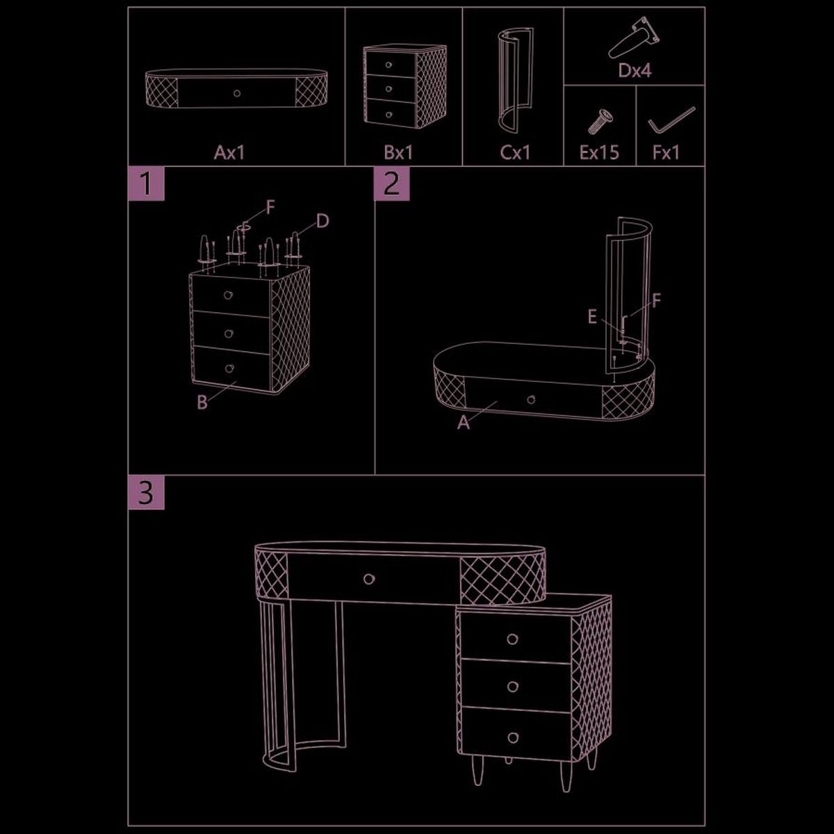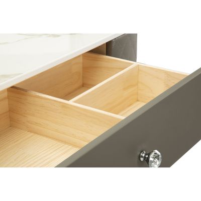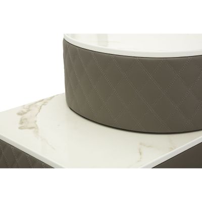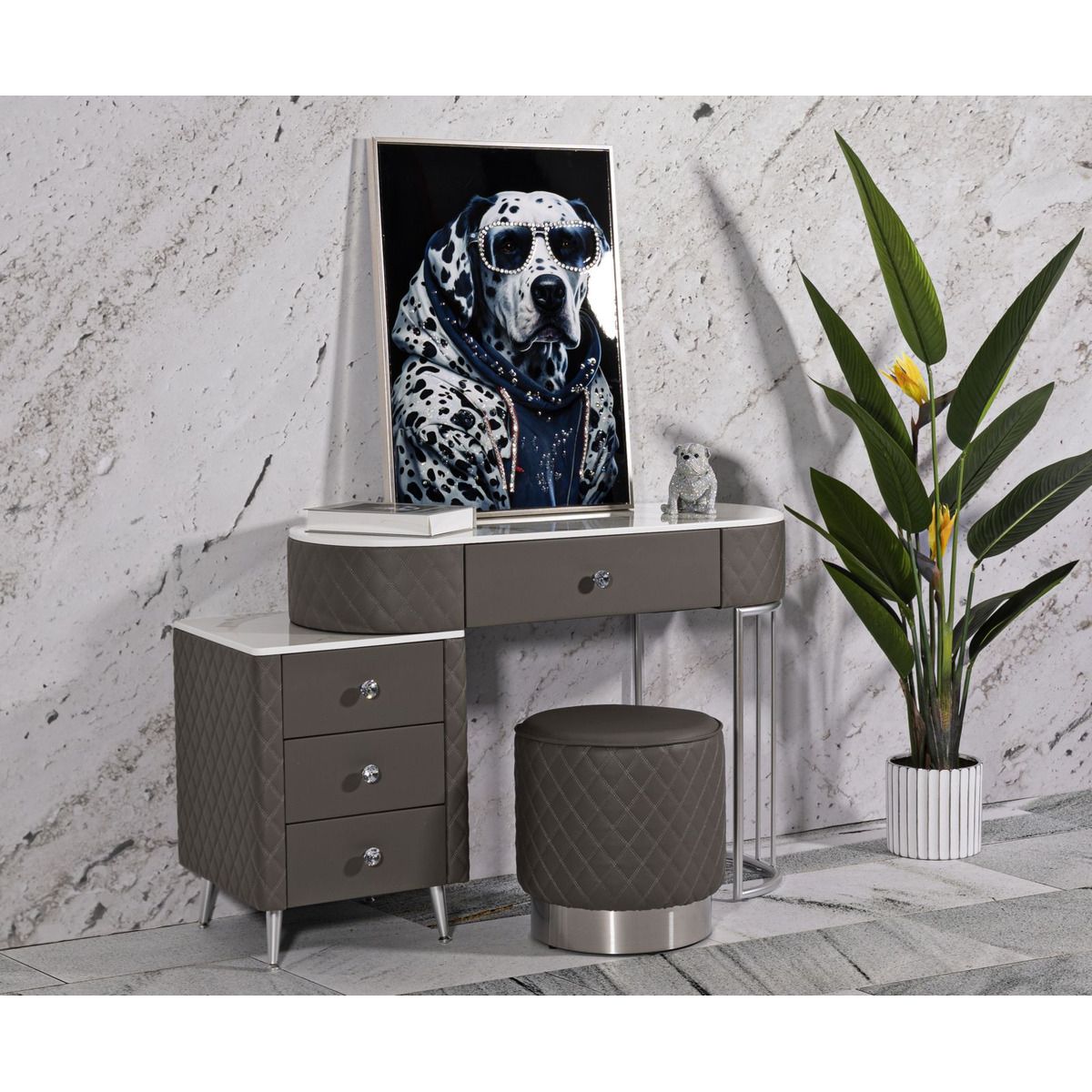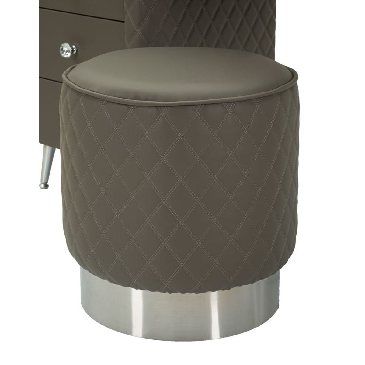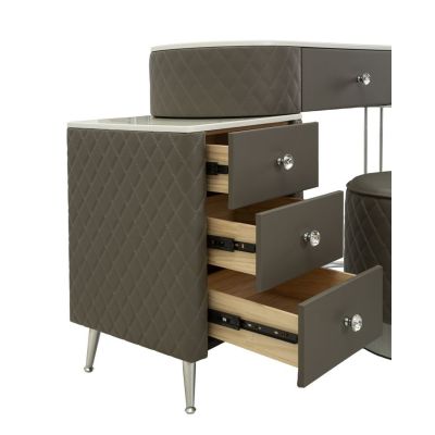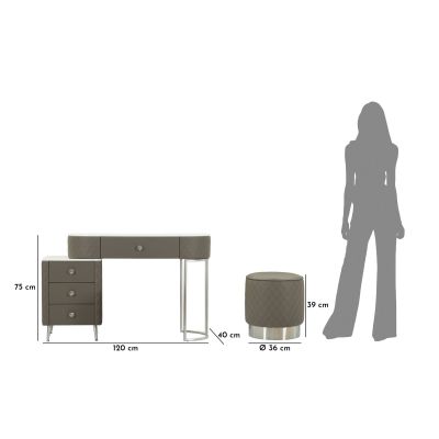 | Description | A luxurious and refined dressing table in quilted imitation leather and silver metal frame, the imitation marble top suggests luxury, and the diamond knobs shine with glamor. Complete with round pouf in quilted imitation leather with silver metal base. |