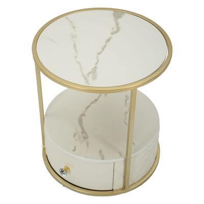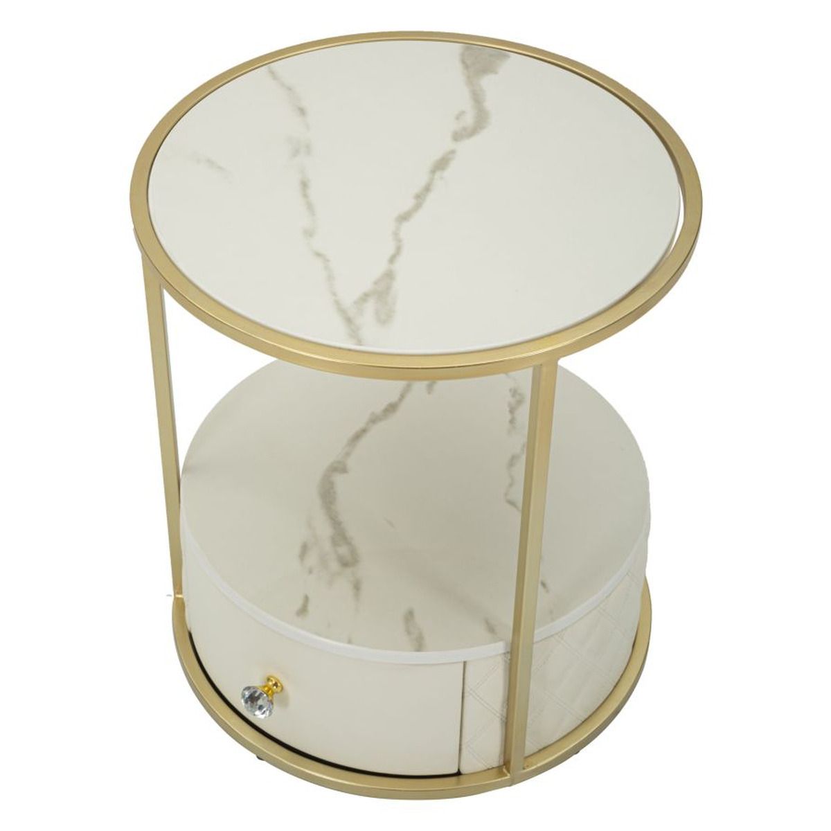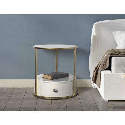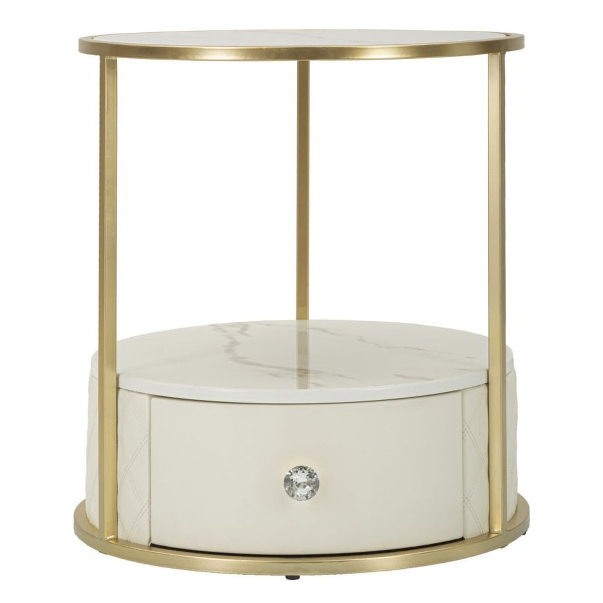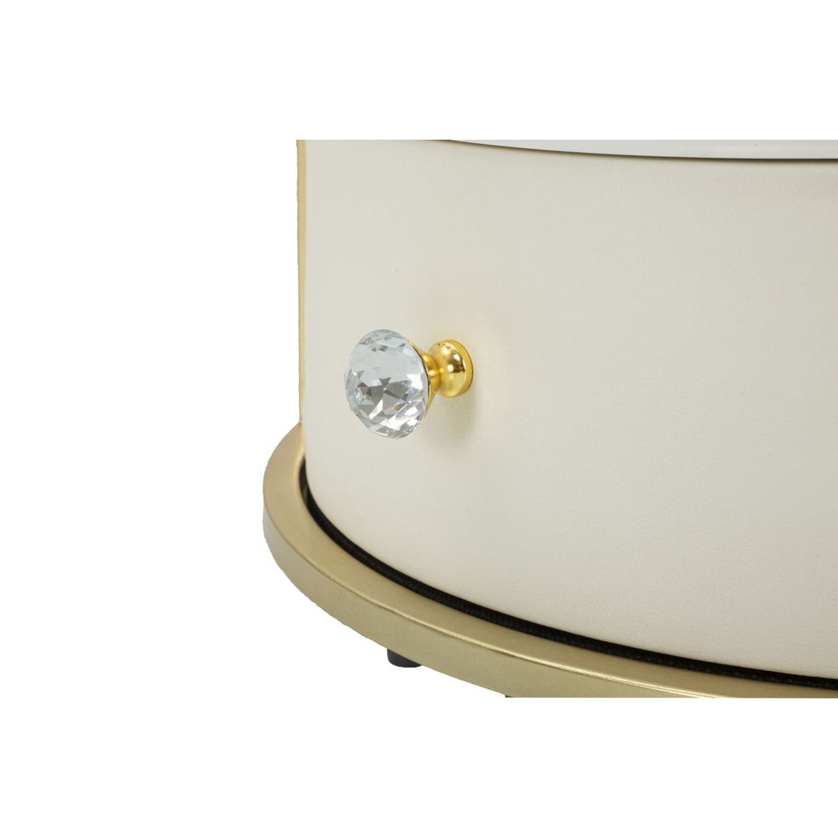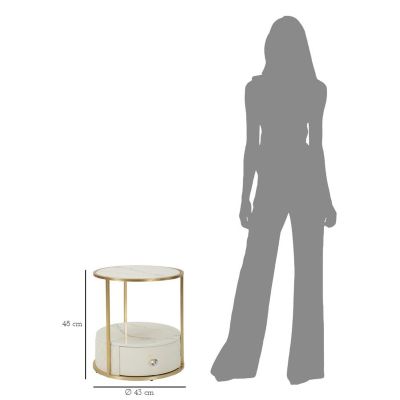 | Descrizione | Comodino rotondo con struttura in metallo dorato con top e ripiano in simil marmo e cassetto. La parte superiore è trapuntanta in simil pelle. |