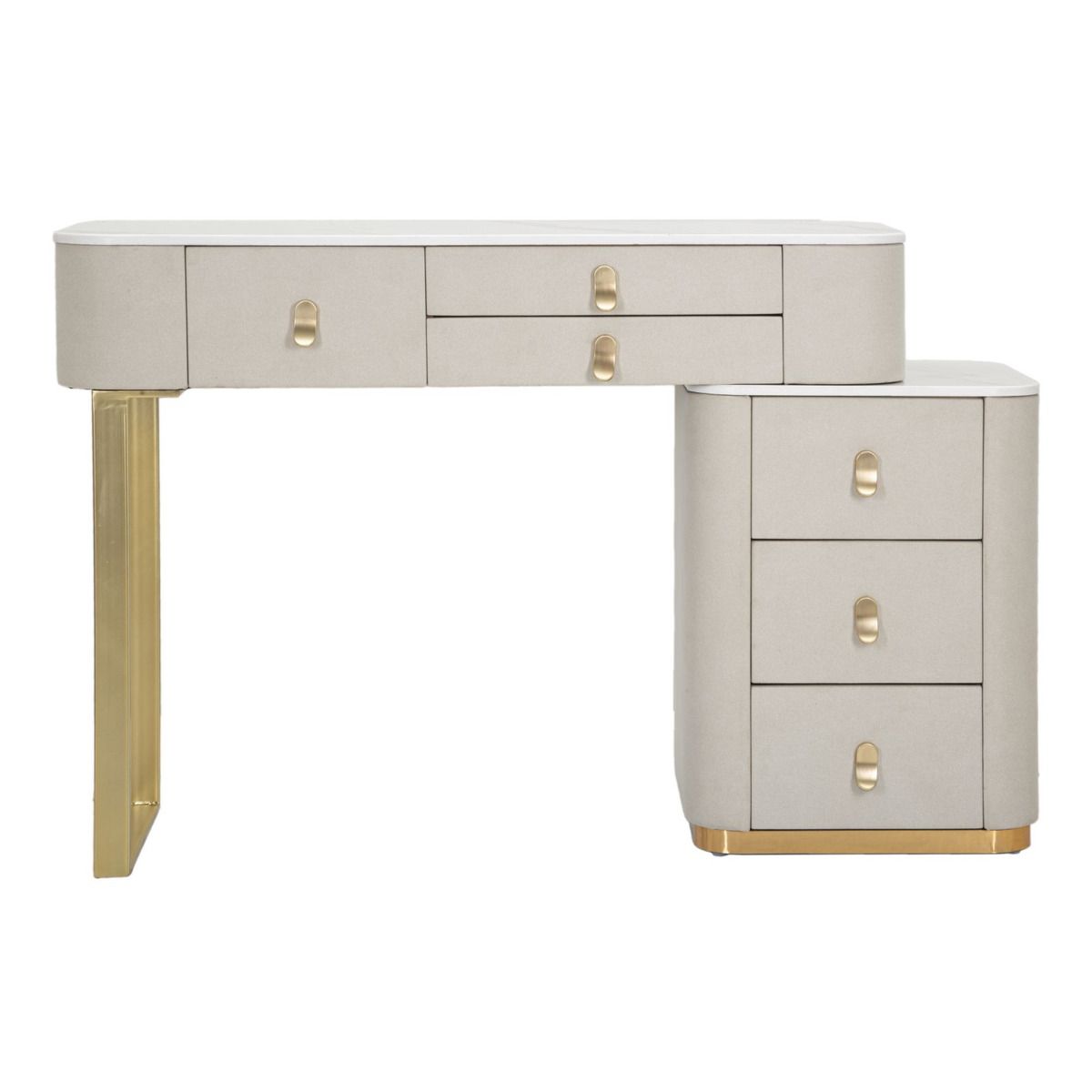 | Descrizione | Toeletta da camera in tessuto bianco con piano in simil marmo completa di 6 cassetti. Le maniglie, le gambe e le rifiniture dorate donano un tocco di eleganza. |