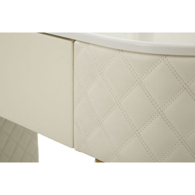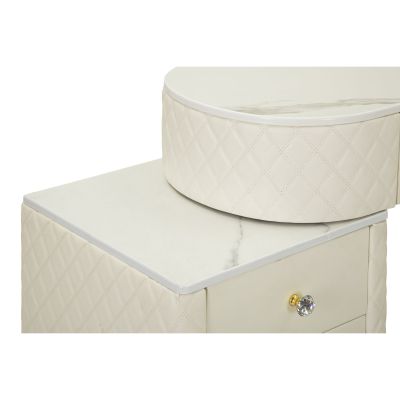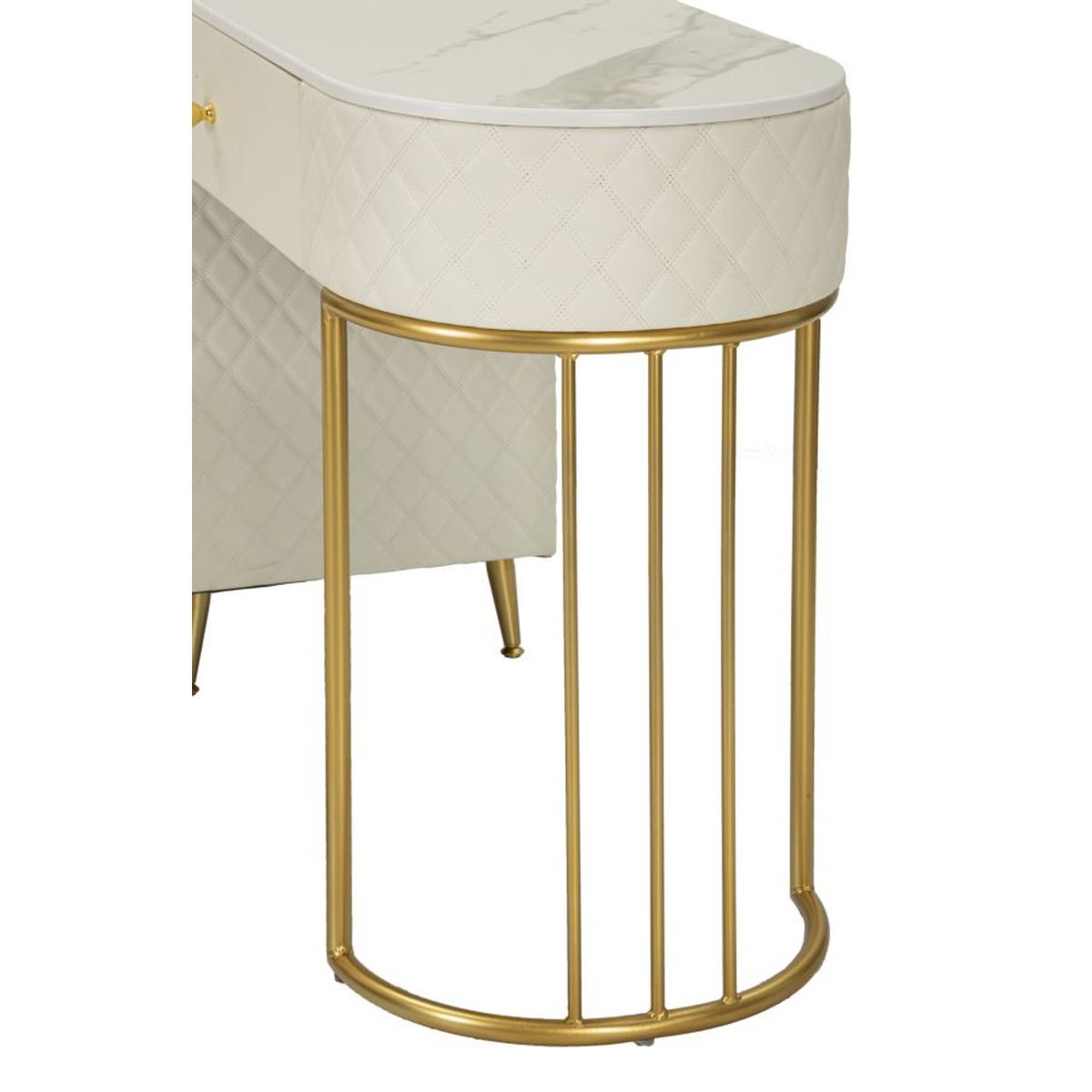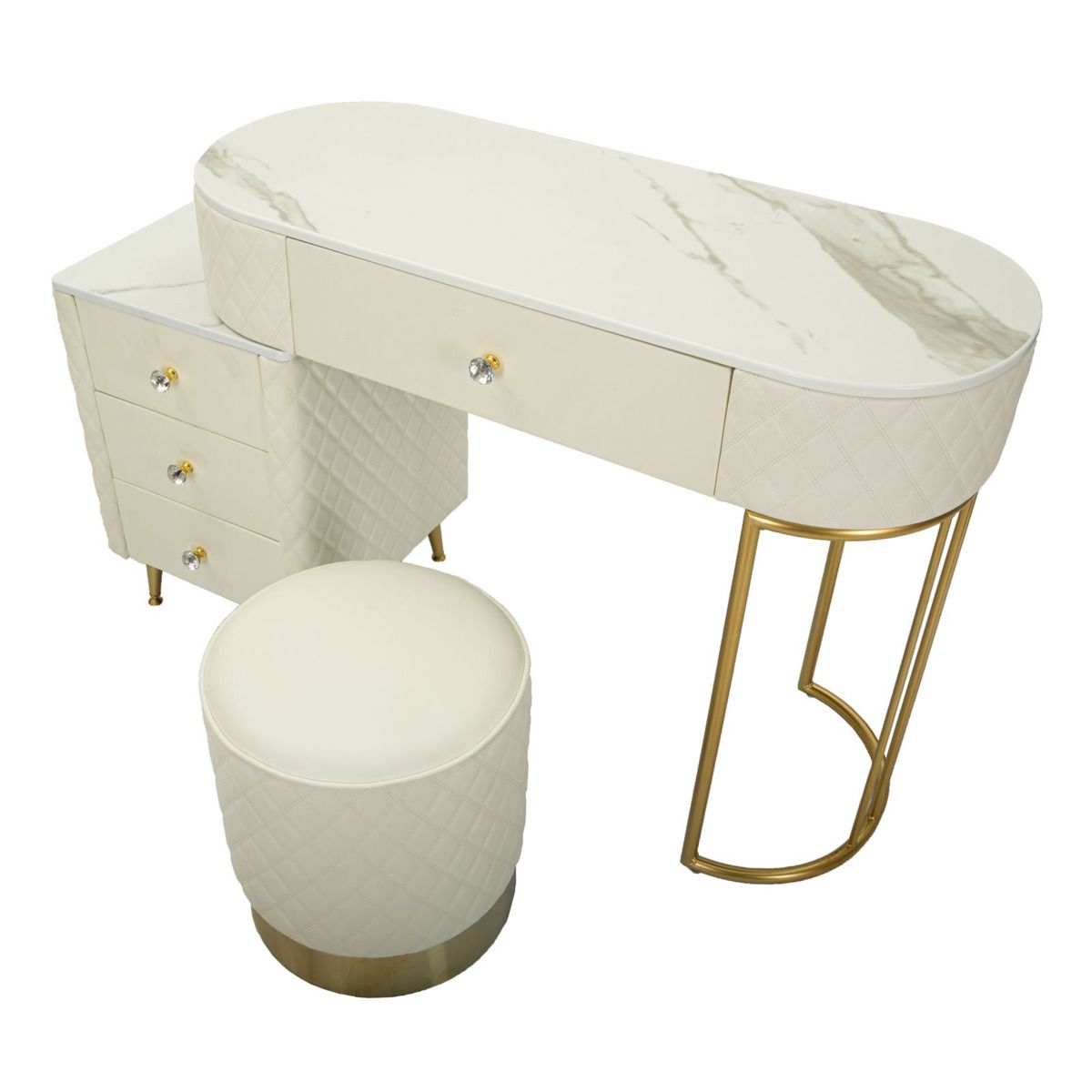 | Descrizione | Una toeletta lussuosa e raffinata in simil pelle trapuntata e struttura in metallo dorato, il top in simil marmo suggerisce lusso, e i pomelli diamantati brillano di glamour. Completa di pouff rotondo in simil pelle trapuntata con base in metallo dorato. |