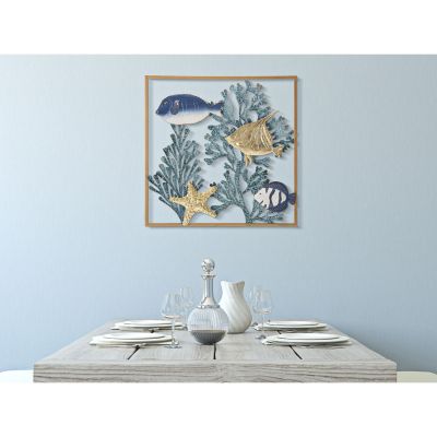 | Descrizione | Pannello decorativo 3D da parete in metallo raffigurante dei pesci e dei coralli in un'elegante cornice dorata. |