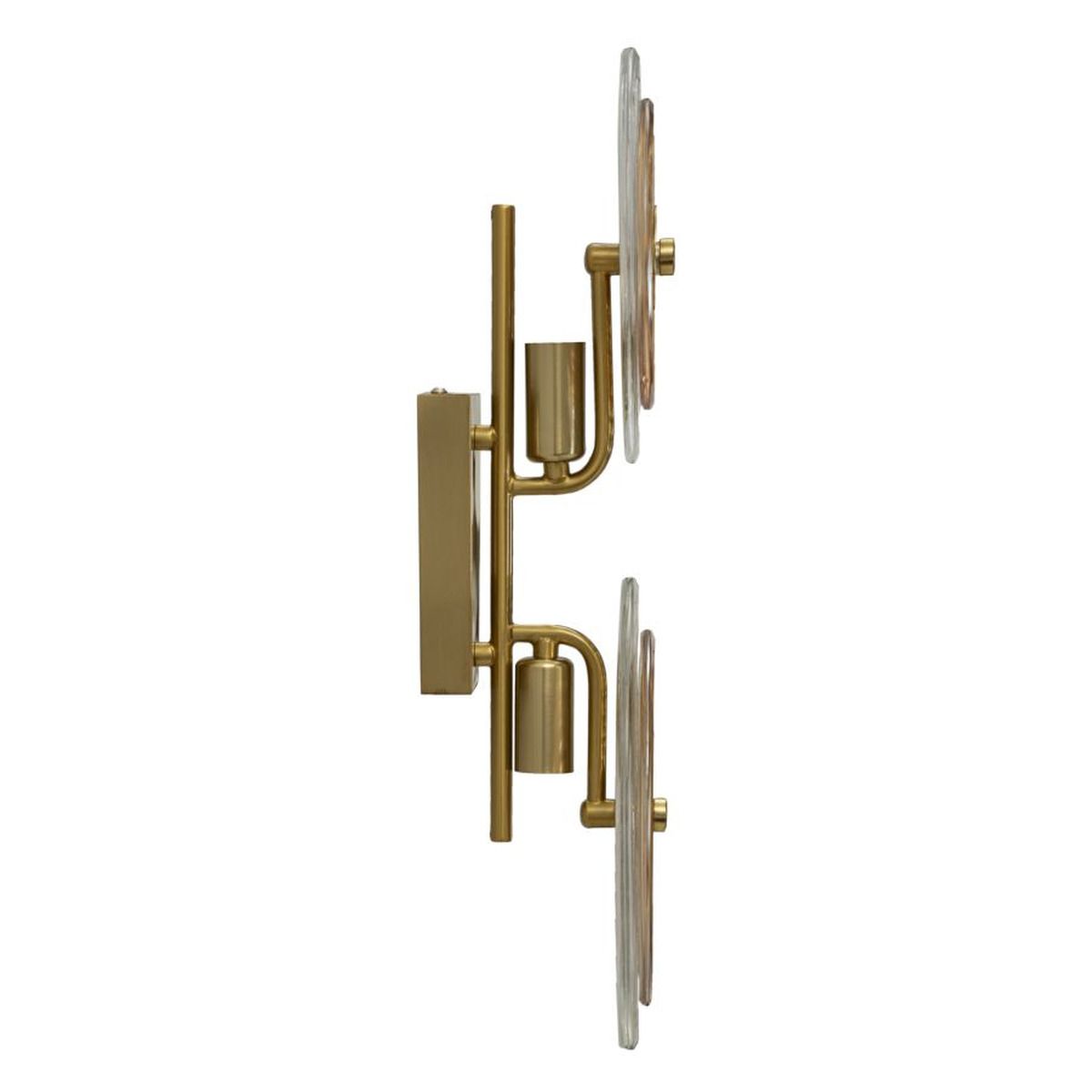 | Descrizione | Lampada da parete con 2 punti luce in metallo dorato dalle linee semplici ed essenziali, impreziosita da eleganti paralumi in vetro con decorazioni in rilievo. |