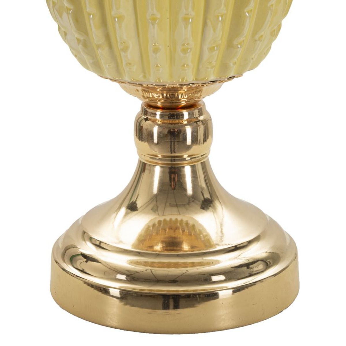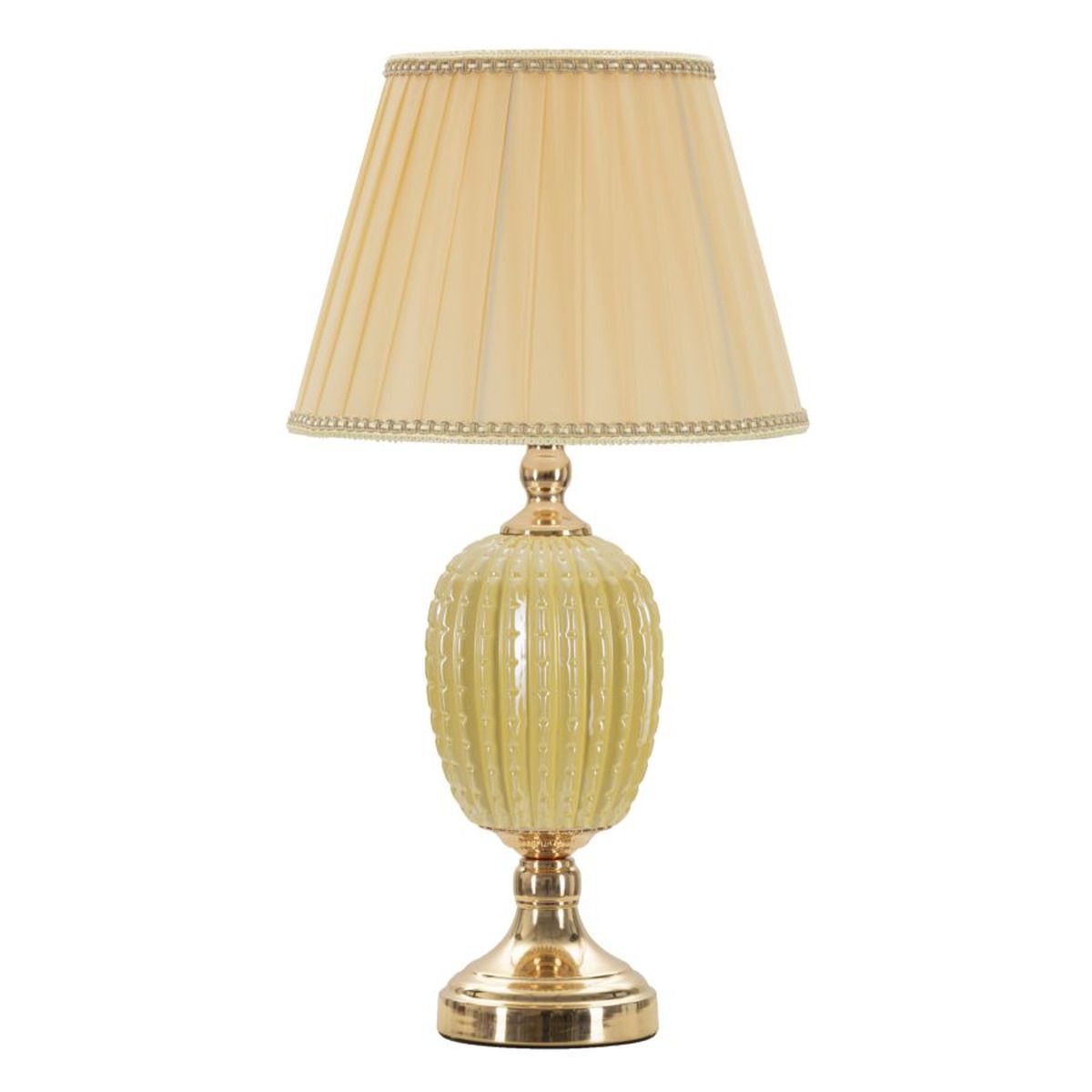 | Descrizione | Elegante lampada da tavolo in metallo dorato con applicazioni beige. Completa di paralume in tessuto beige con finiture dorate. |