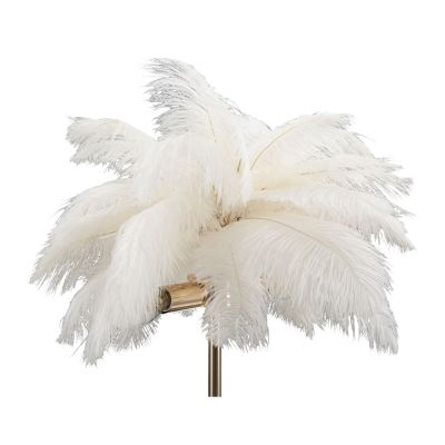 | Descrizione | Lampada da tavolo in metallo dorato con 2 punti luce e paralume composto da piume bianche. |