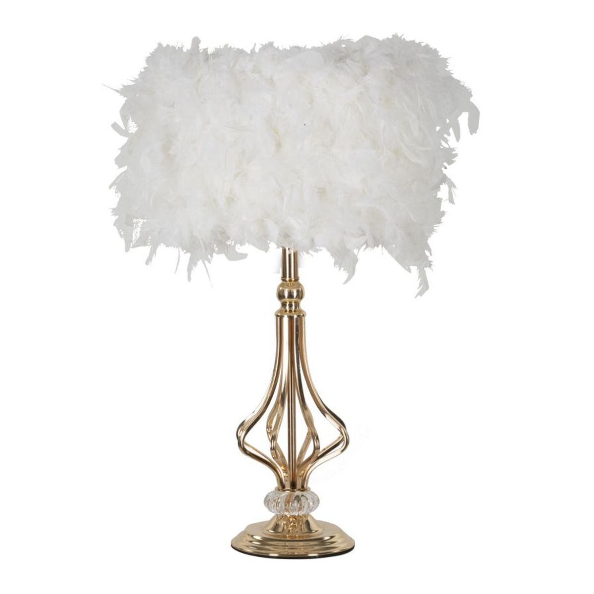| Descrizione | Lampada da tavolo in metallo dorato dal design design geometrico, completo di paralume con eleganti piume sintetiche. |