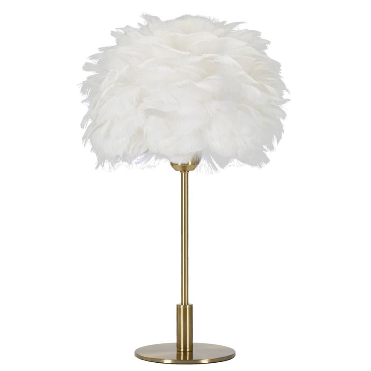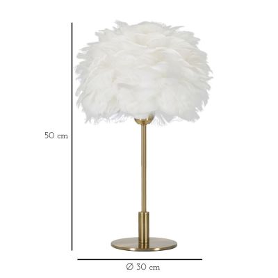 | Descrizione | Lampada da tavolo in metallo dorato con paralume composto da piume bianche. |
