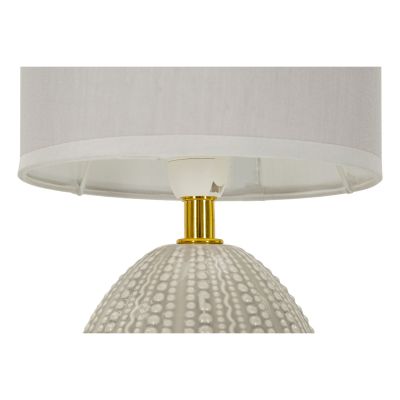 | Descrizione | Lampada da comodino elegante con base grigia e decorazioni in rilievo irregolari, ideale per aggiungere stile e luminosità alla tua stanza. Completa di paralume in tessuto grigio.. |