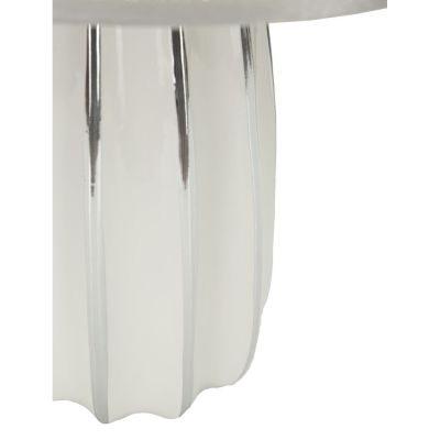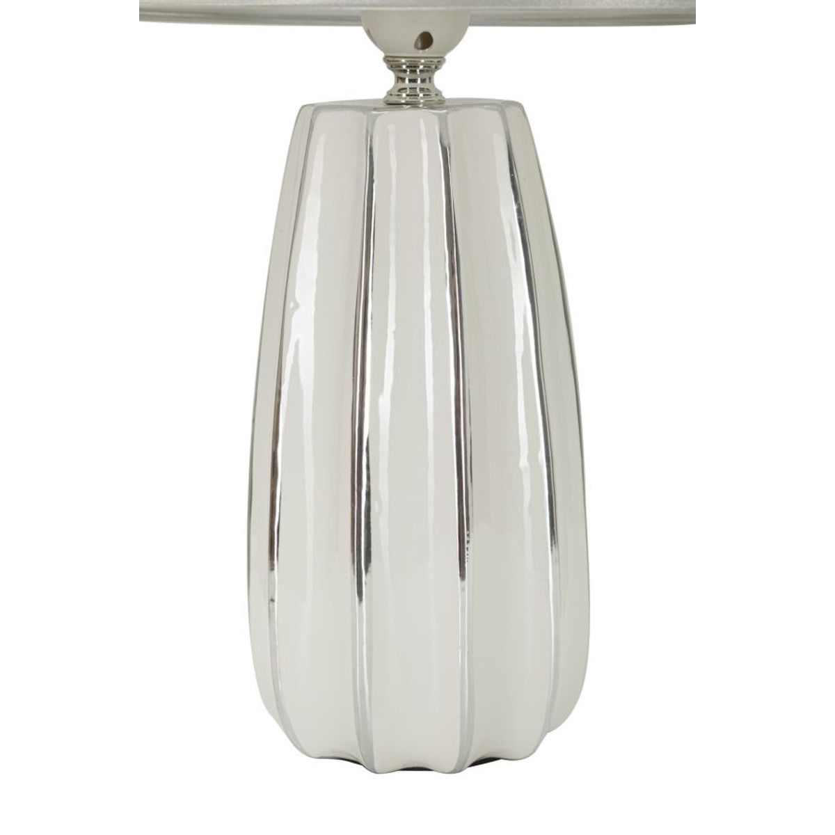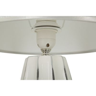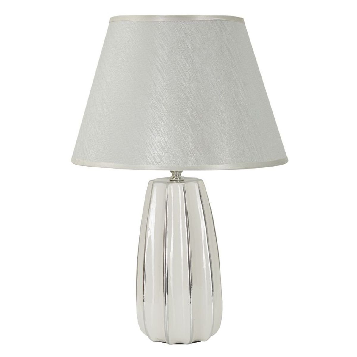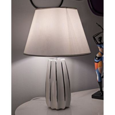 | Descrizione | Lampada da tavolo in ceramica bianca e argentata dalle linee morbide e regolari. Completa di paralume in tessuto argentato. |