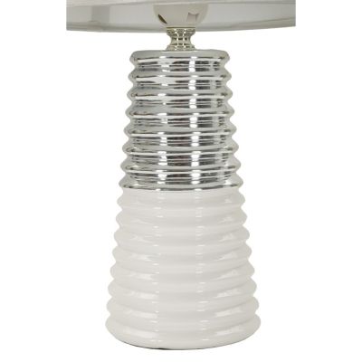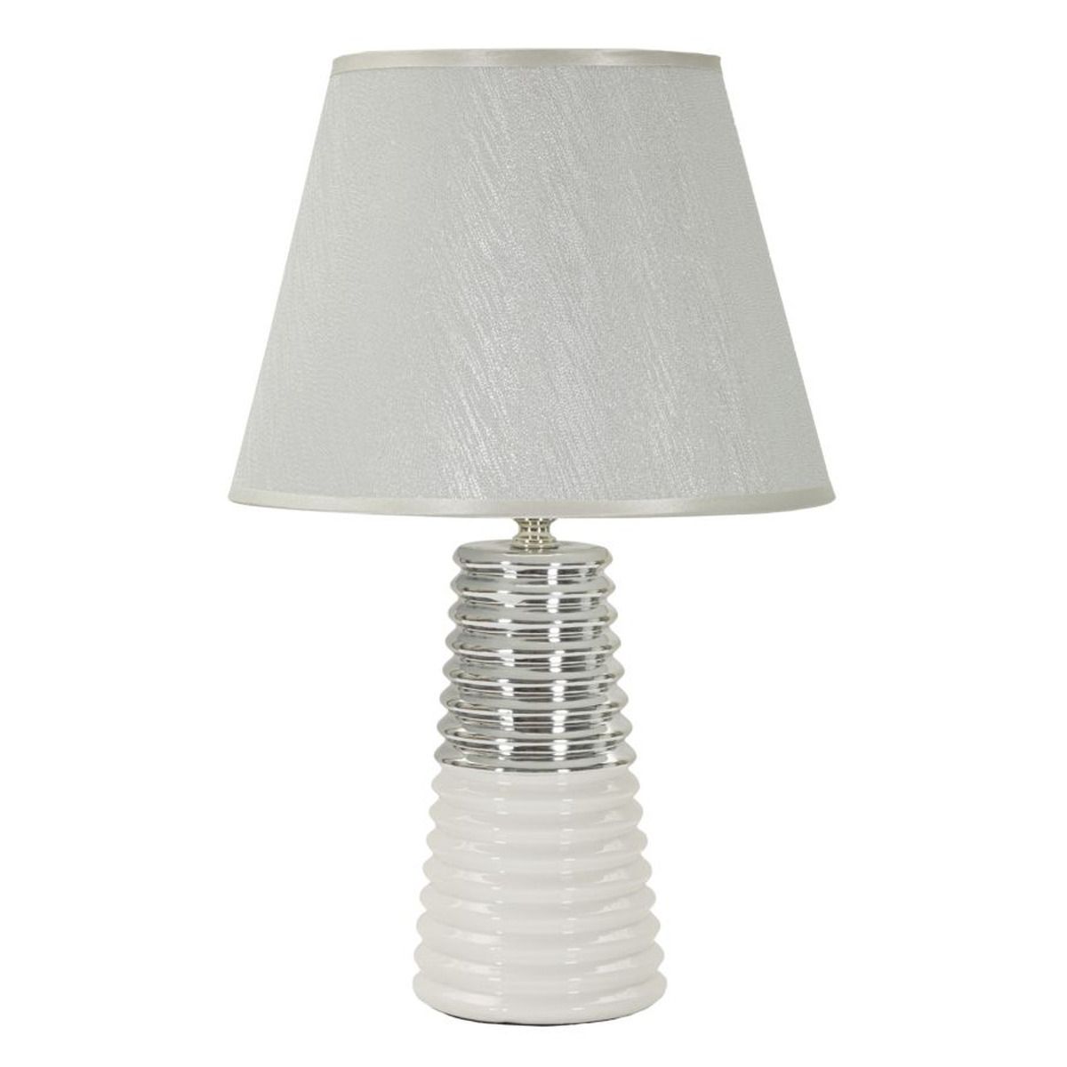 | Descrizione | Lampada da tavolo in ceramica bianca e argentata elegantemente decorata con cerchi concentrici. Completa di paralume in tessuto argentato. |