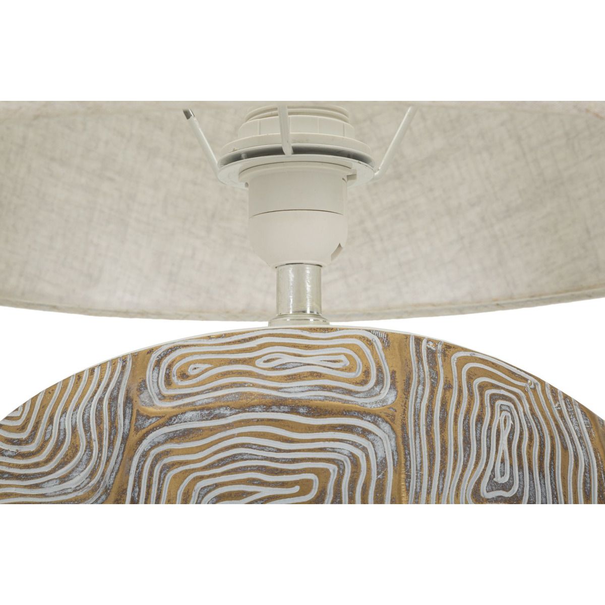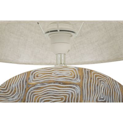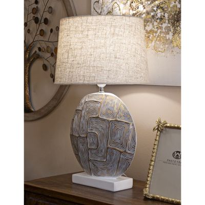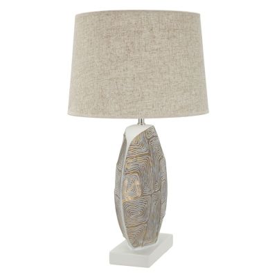 | Descrizione | Lampada da tavolo in resina con eleganti decorazioni geometriche in rilievo. Completa di paralume in tessuto beige. |