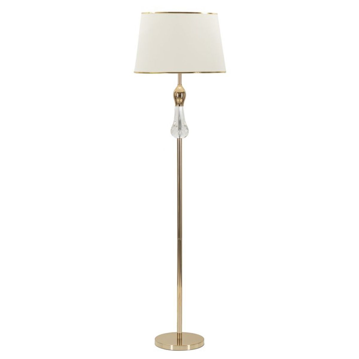 | Descrizione | Elegante piantana in metallo dorato con applicazioni trasparenti. Completa di paralume in tessuto beige con finiture dorate. |