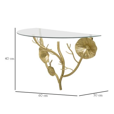 | Descrizione | Comodino semicircolare da appendere in metallo dorato decorato con rami e foglie e con piano in vetro. |