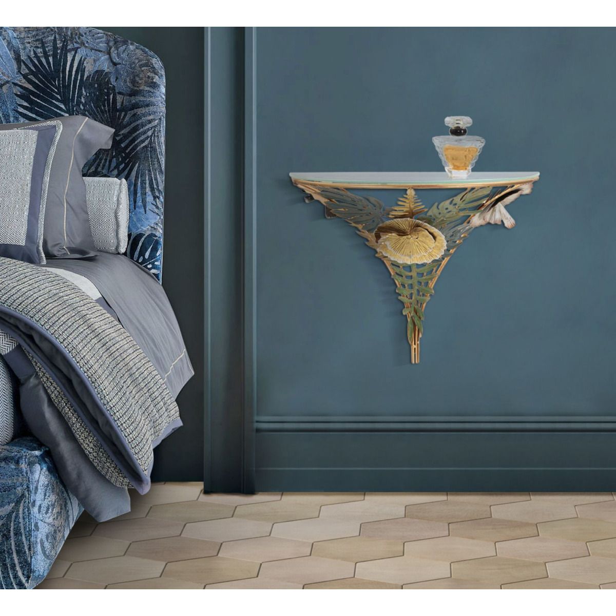| Descrizione | Comodino semicircolare da parete in metallo dorato con piano in vetro. La base è riccamente decorata da foglie e fiori in vari colori. Il particolare design dona un tocco di classe e relax ad ogni ambiente. |