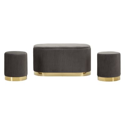 | Descrizione | Panca contenitore e due sgabelli in velluto grigio plissettato con base dorata. Raffinato e discreto, è perfetto per donare eleganza sobria a ingresso, camera o soggiorno. |