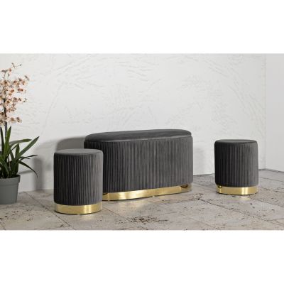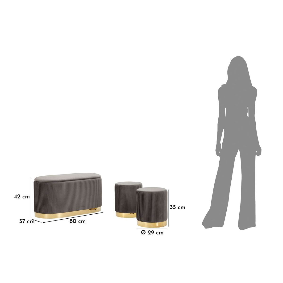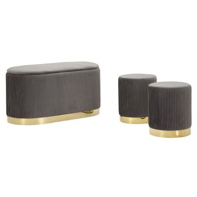 | Descrizione | Panca contenitore e due sgabelli in velluto grigio plissettato con base dorata. Raffinato e discreto, è perfetto per donare eleganza sobria a ingresso, camera o soggiorno. |