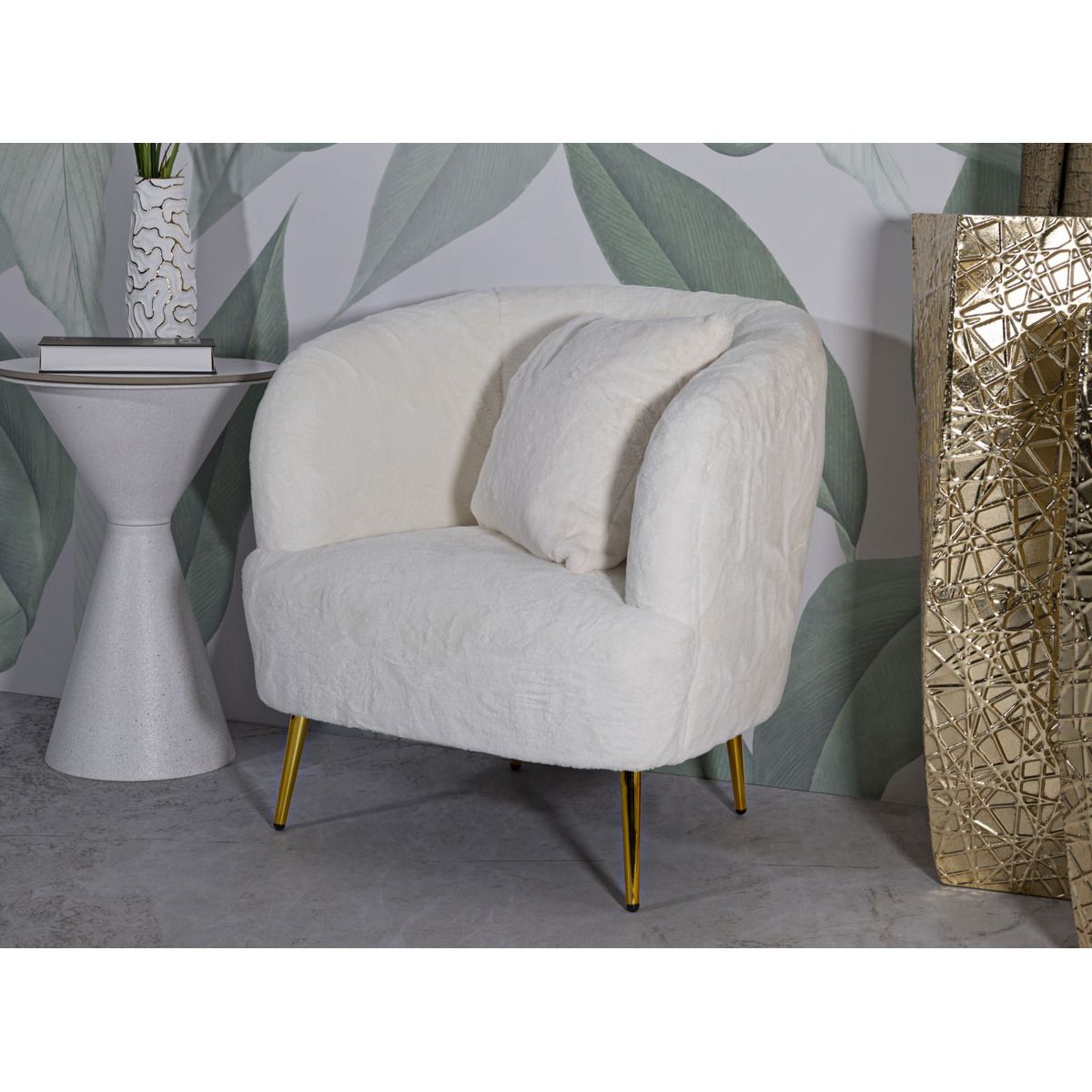 | Descrizione | Poltrona bianca con gambe dorate da assemblare, rivestito in morbida pellliccia sintetica. Ideale per ambienti moderni e raffinati, aggiunge un tocco di lusso e comfort. |