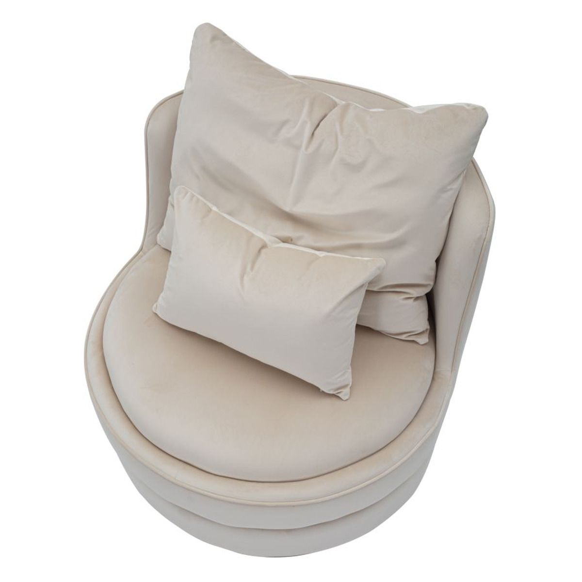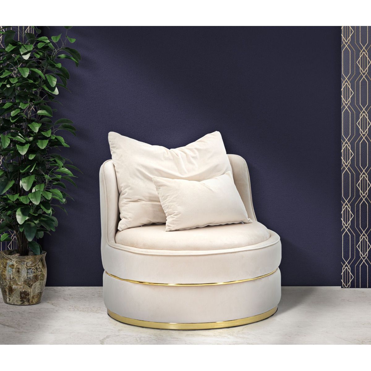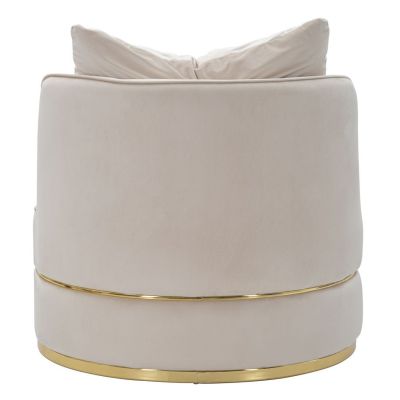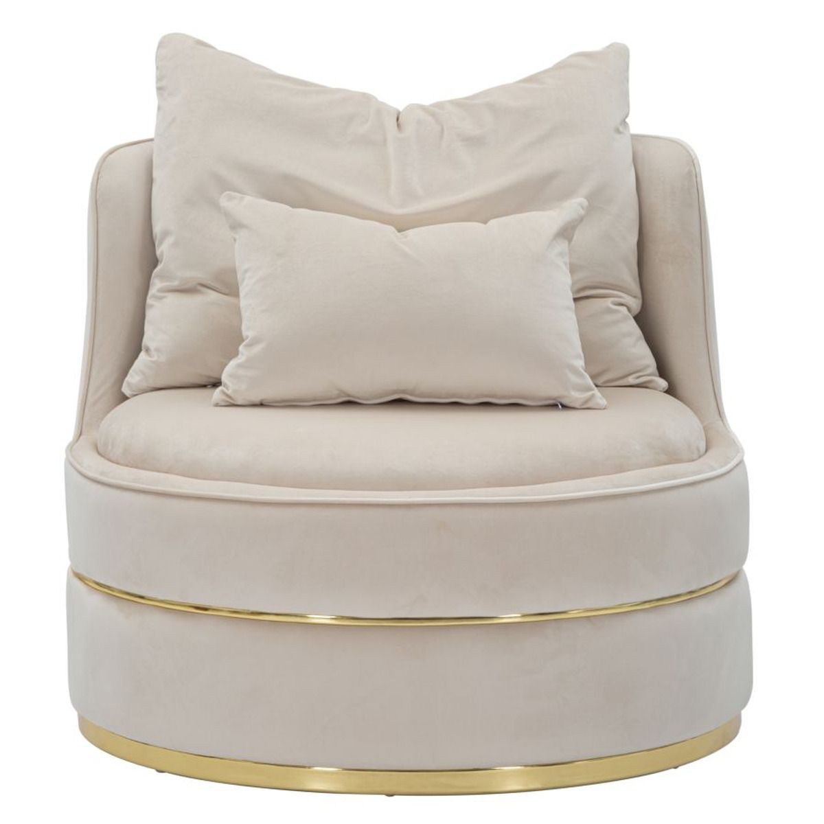 | Descrizione | Elegante ed originale poltrona in tessuto imbottito color crema. Due decori dorati per tutta la circonferenza donano un tocco di classe all'oggetto. La poltrona è completa di 2 cuscini. |