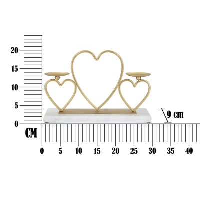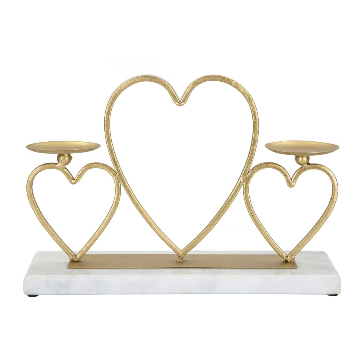 | Descrizione | Portacandele in metallo dorato con base in marmo bianco. La struttura è realizzata con 3 cuori. Può contenere 2 candele. |