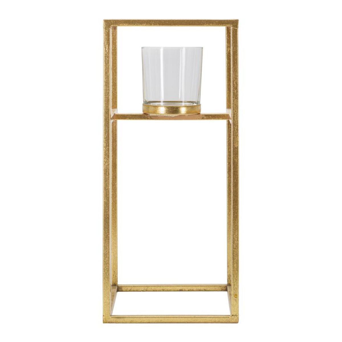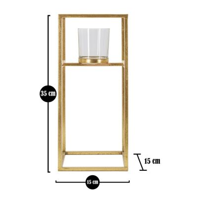| Descrizione | Portacandele in metallo dorato con bicchierino in vetro dalla struttura geometricamente squadrata e lineare. |