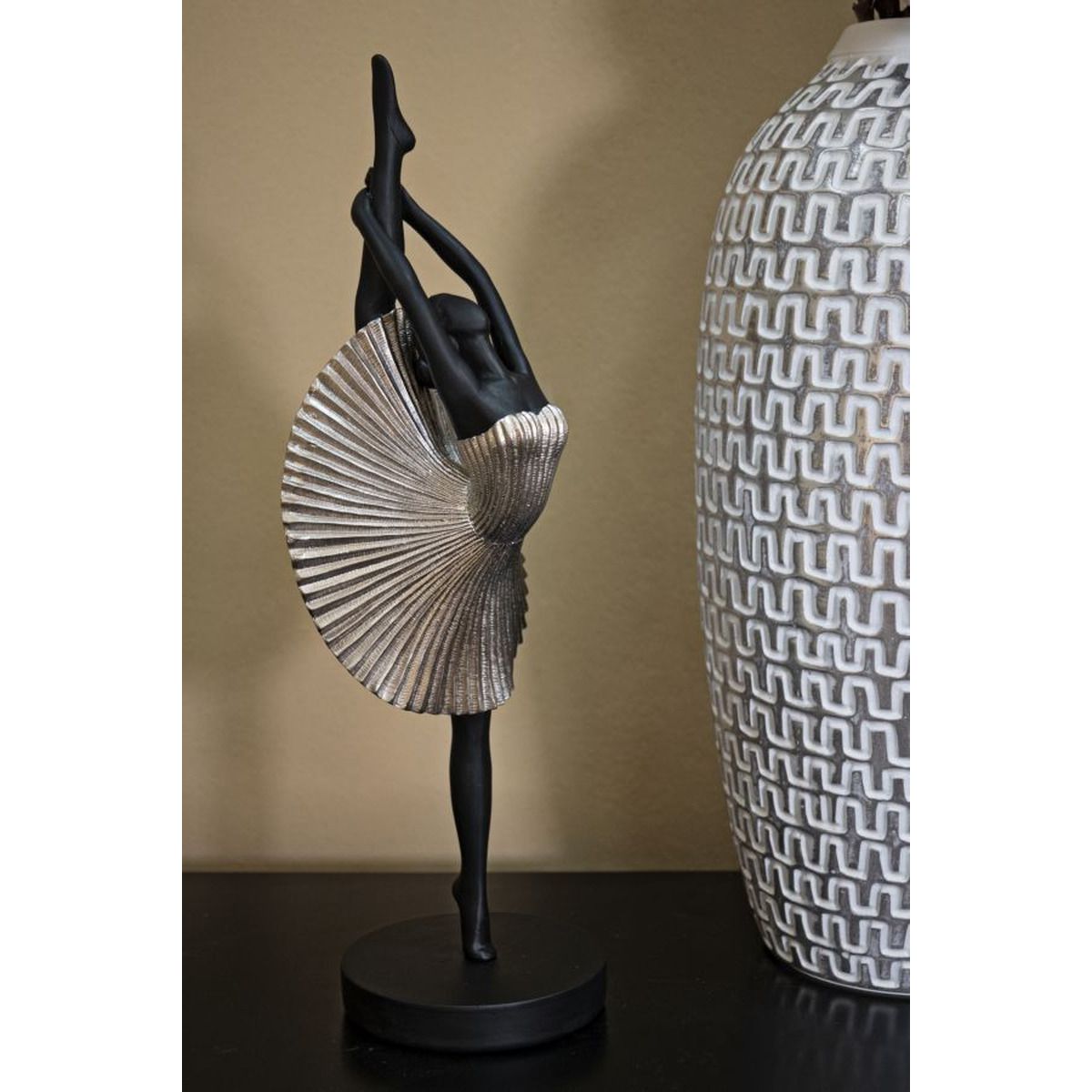 | Descrizione | Statuetta a forma di ballerina con elegante vestito da sera argento. |