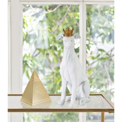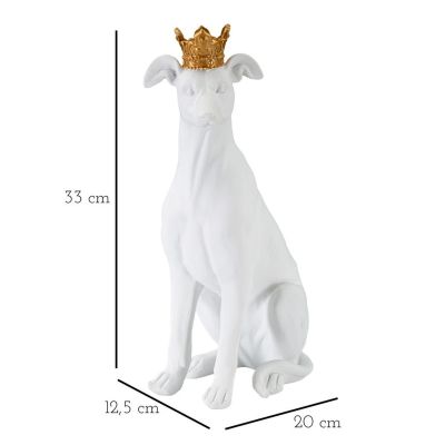 | Descrizione | Statua di cane seduto bianco con elegante corona dorata. |