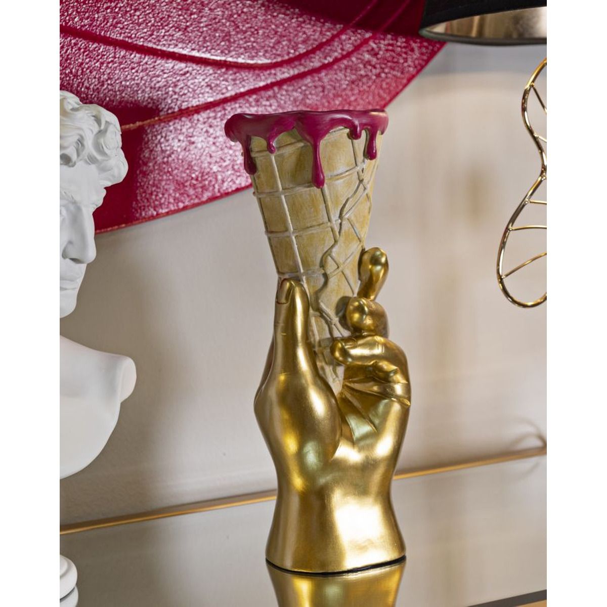 | Descrizione | Ironico e sorprendente, il Cono Portafiori gioca con l'arte pop e la voglia di stupire. Una mano dorata che regge un gelato floreale: un mix audace di gusto, creatività e stile glamour. |