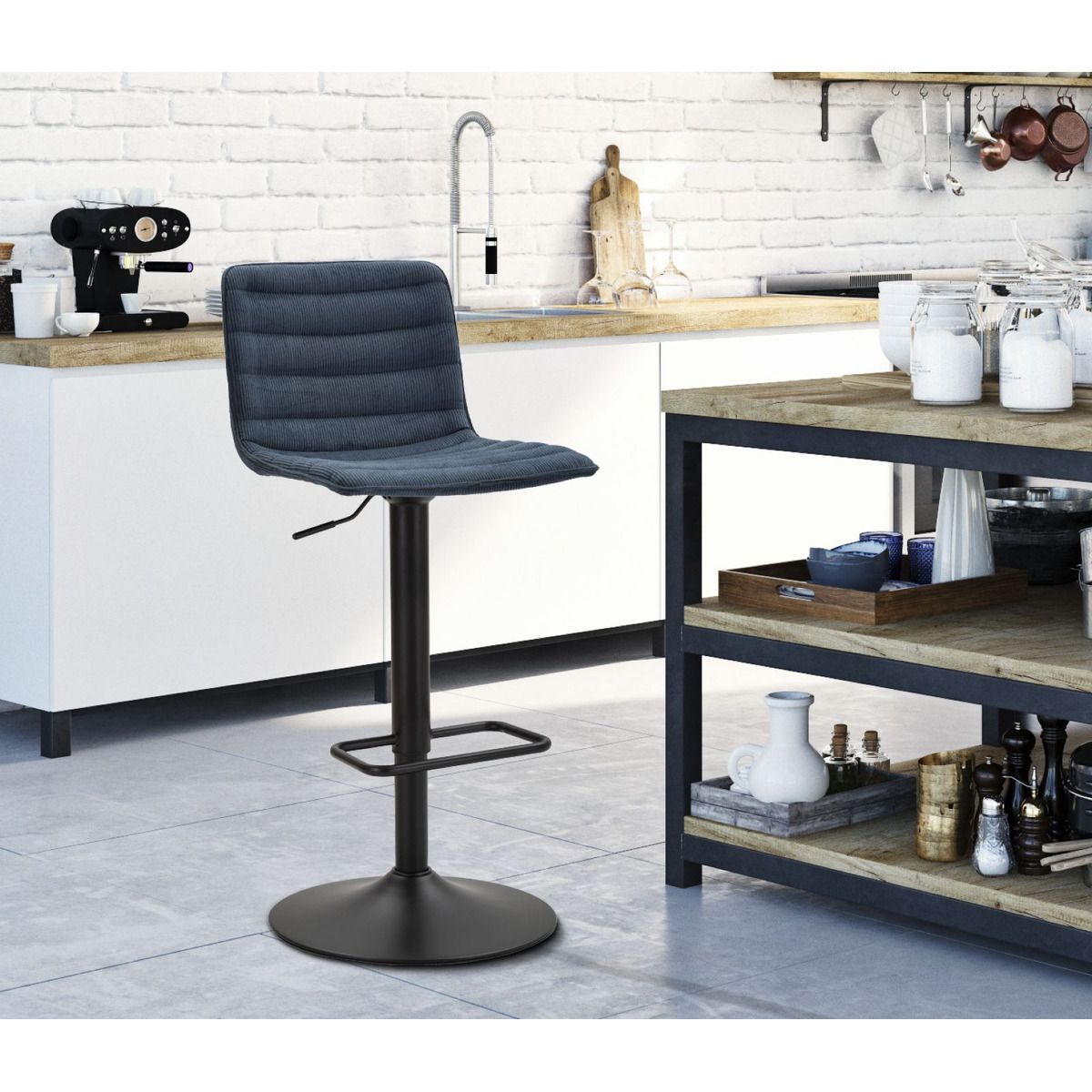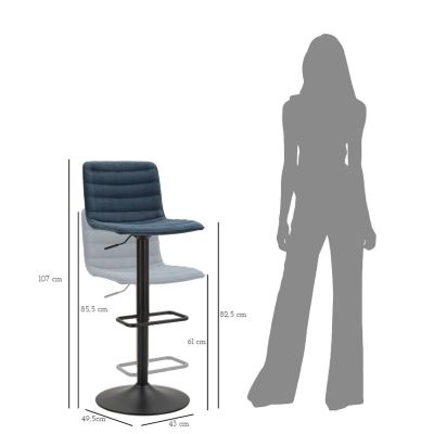 | Descrizione | Sgabello bar rotondo girevole in metallo e tessuto imbottito con schienale imbottito. Completo di regolatore d'altezza. Il design semplice richiama gli anni '70. |