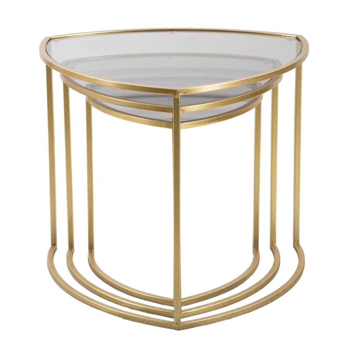 | Descrizione | Set di tre tavolinetti triangolari con angoli smussati con struttura in metallo dorato e piano in vetro. |