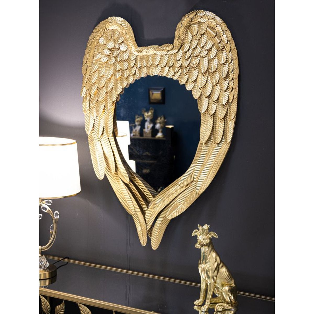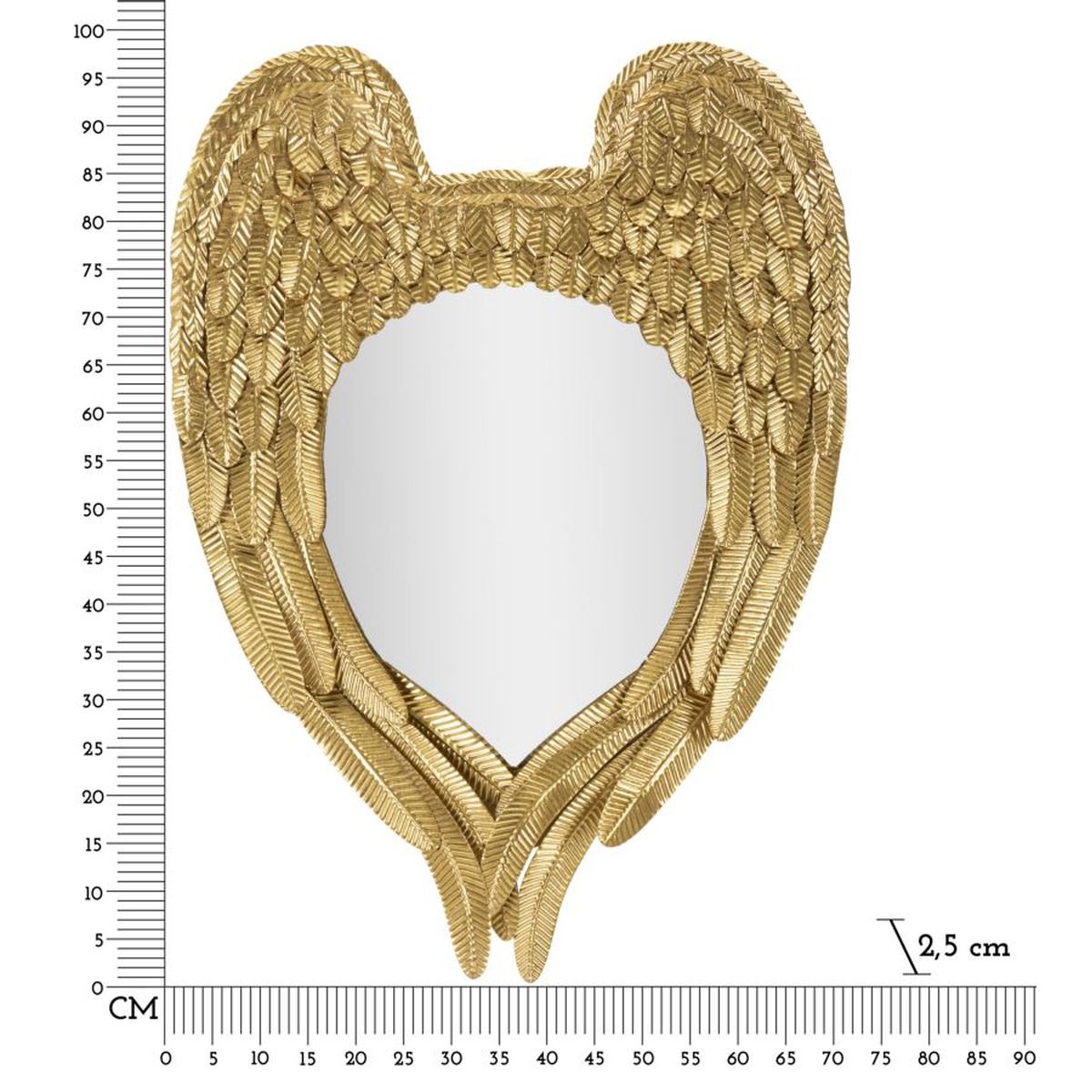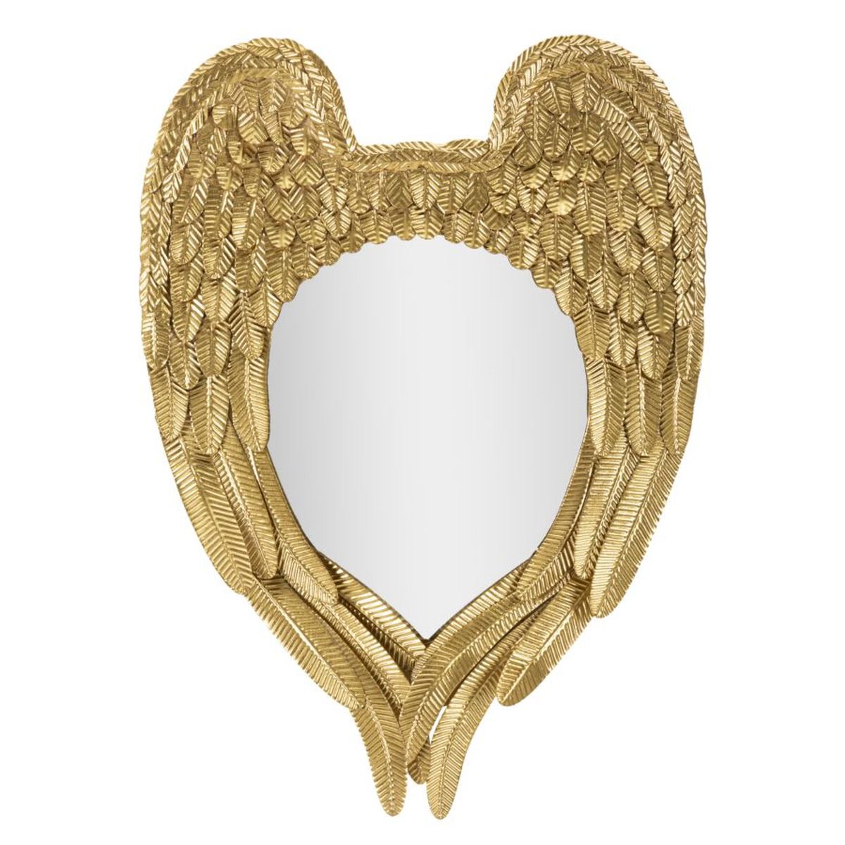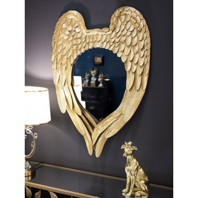 | Descrizione | Specchio da parete con cornice in metallo dorato a forma di paio di ali che si accoppiano. |