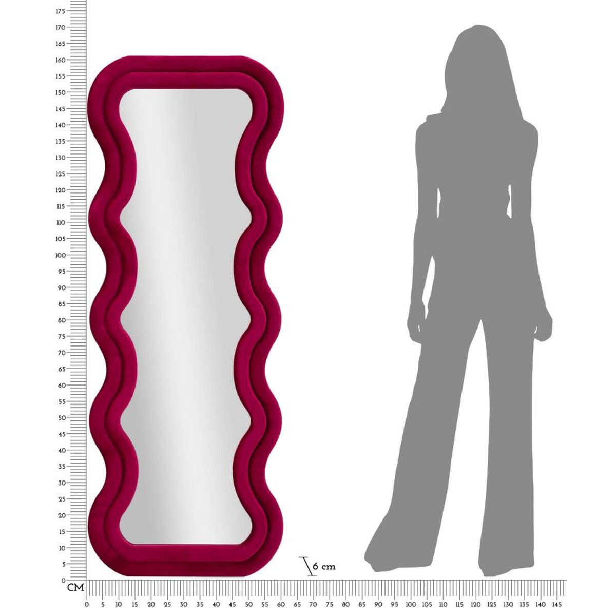 | Descrizione | Specchio da parete con cornice in legno rivestito in velluto dalle linee ondulate. |