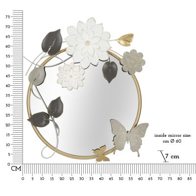 | Descrizione | Specchio rotondo da parete con cornice dorata impreziosita da fiori, foglie e farfalle in vari colori. |