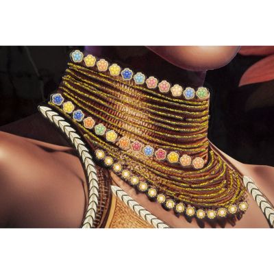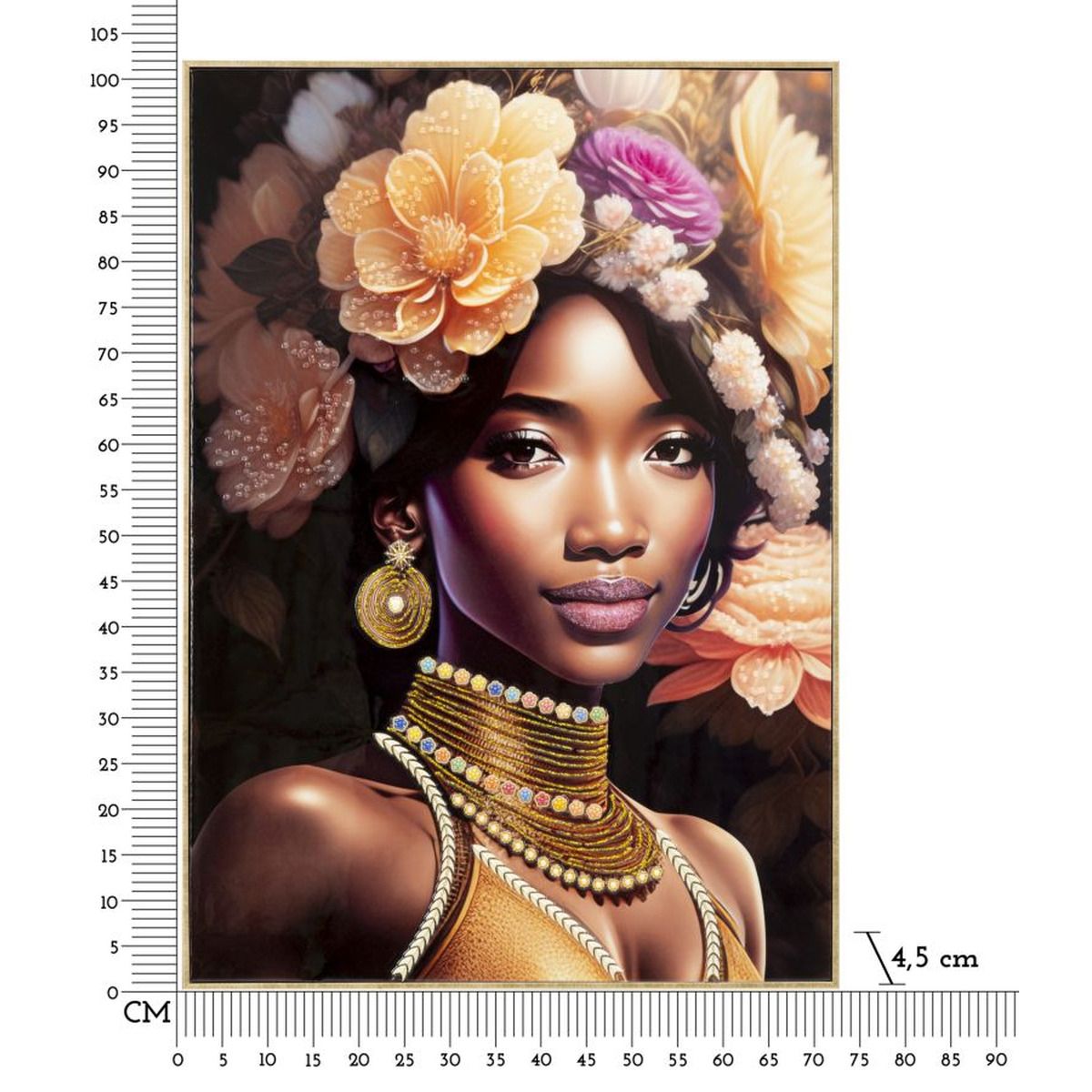| Descrizione | Dipinto su tela con intelaiatura in legno raffigurante una donna in abiti tradizionali e con fiori sulla testa. Completo di cornice in metallo dorato. |