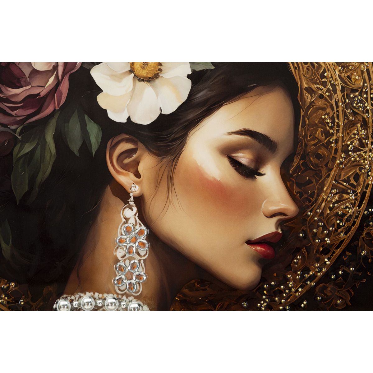 | Descrizione | Un ritratto femminile raffinato e magnetico, impreziosito da dettagli floreali e colori intensi. Un'opera che evoca eleganza, mistero e femminilità senza tempo. |