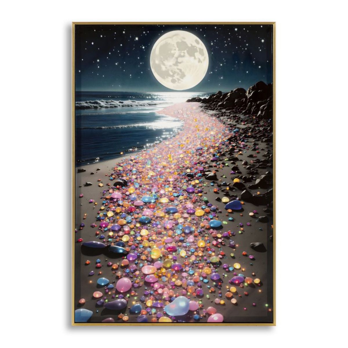 | Descrizione | Un paesaggio notturno illuminato dalla luna e da mille riflessi colorati sulla riva. Un quadro suggestivo che unisce romanticismo e magia. |