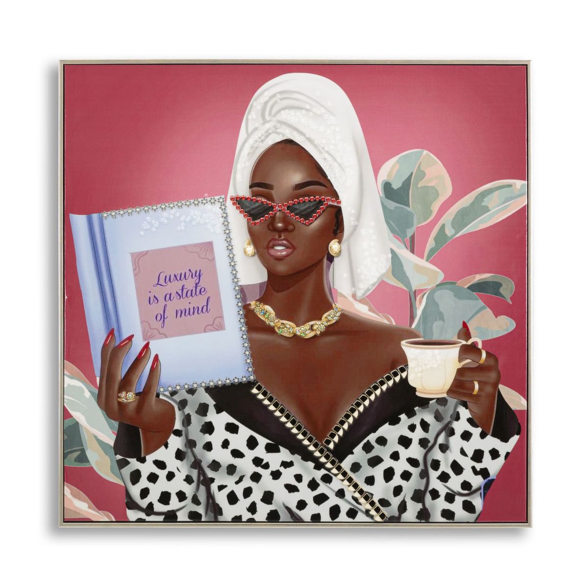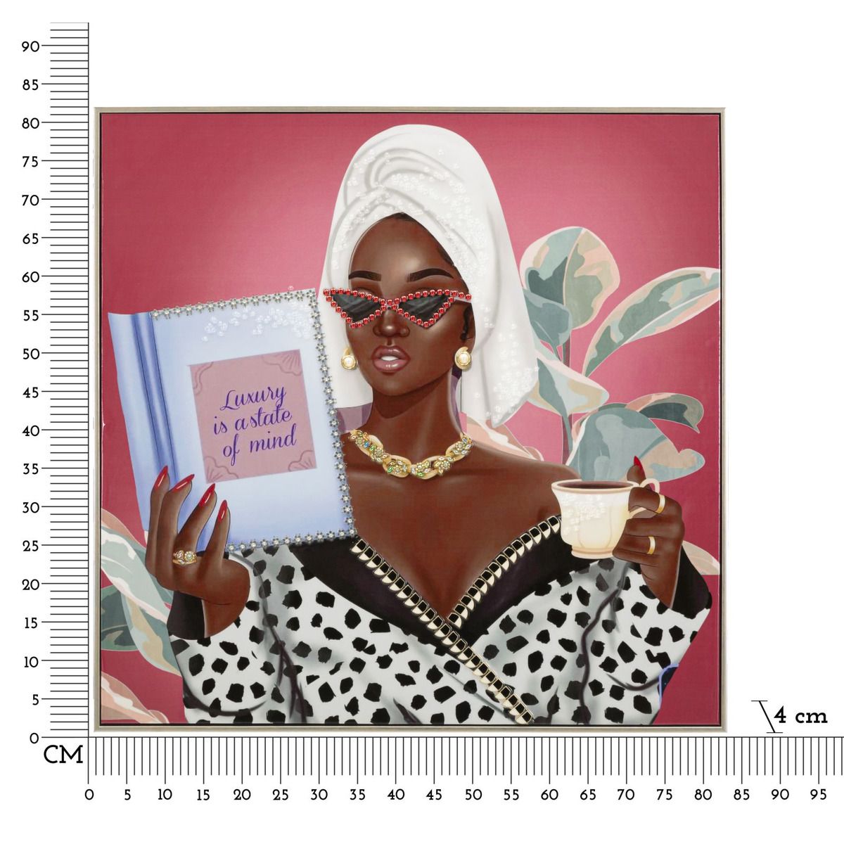 | Descrizione | Dipinto su tela laccato con cornice incarna eleganza e relax con un tocco glamour. La figura femminile, avvolta in un morbido accappatoio, con occhiali alla moda e una tazza di tè, trasmette un'atmosfera di lusso e benessere. |