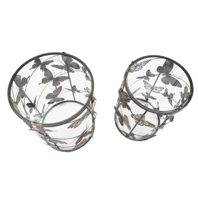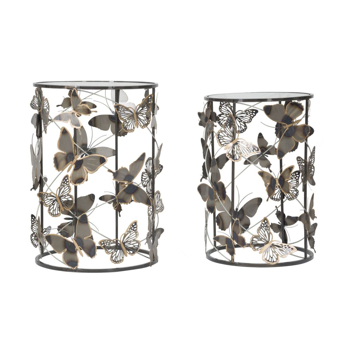 | Descrizione | Coppia di tavolinetti rotondi in metallo e vetro con decorazioni a forma di farfalle. Le linee semplici unite alle particolari decorazioni lo rendono un elemento particolare per rendere unica ogni stanza. |
