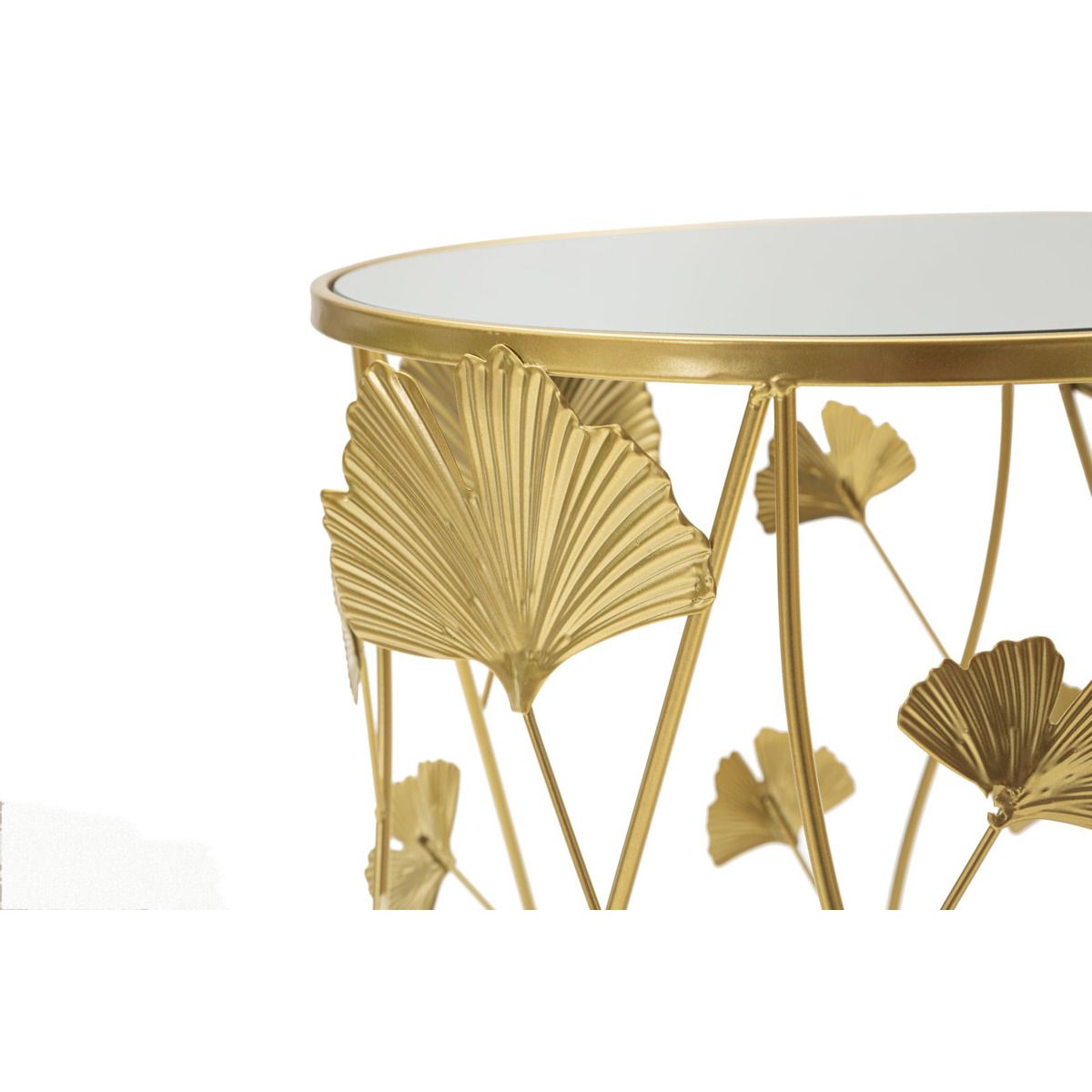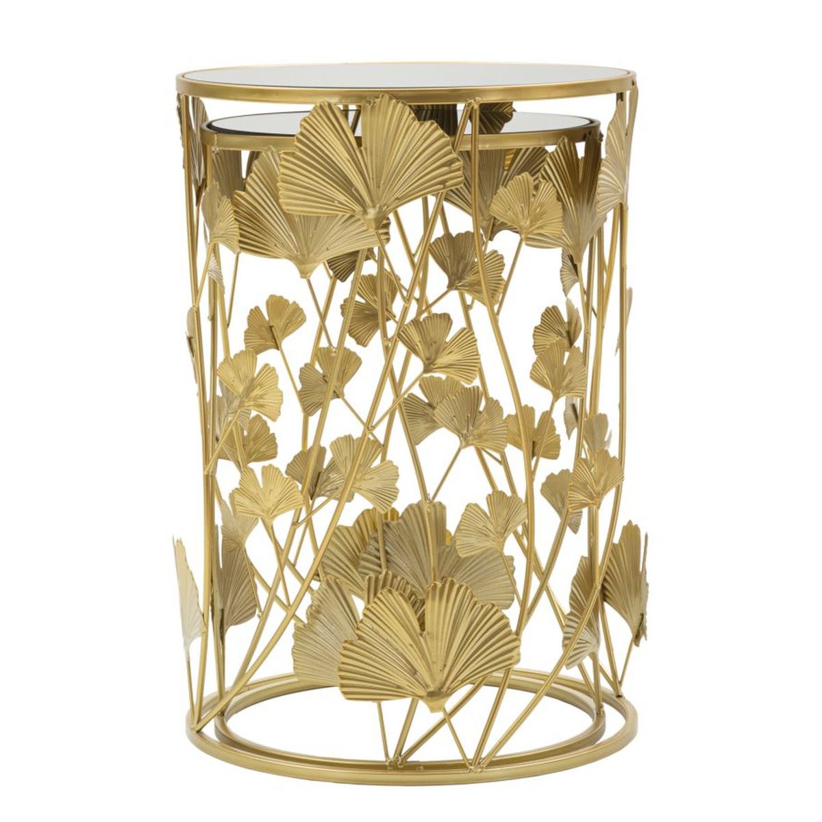 | Descrizione | Coppia di tavolinetti rotondi in metallo dorato con piano in vetro a specchio. La particolare ed elegante decorazione composta da foglie dona un tocco di unicità all'articolo. |