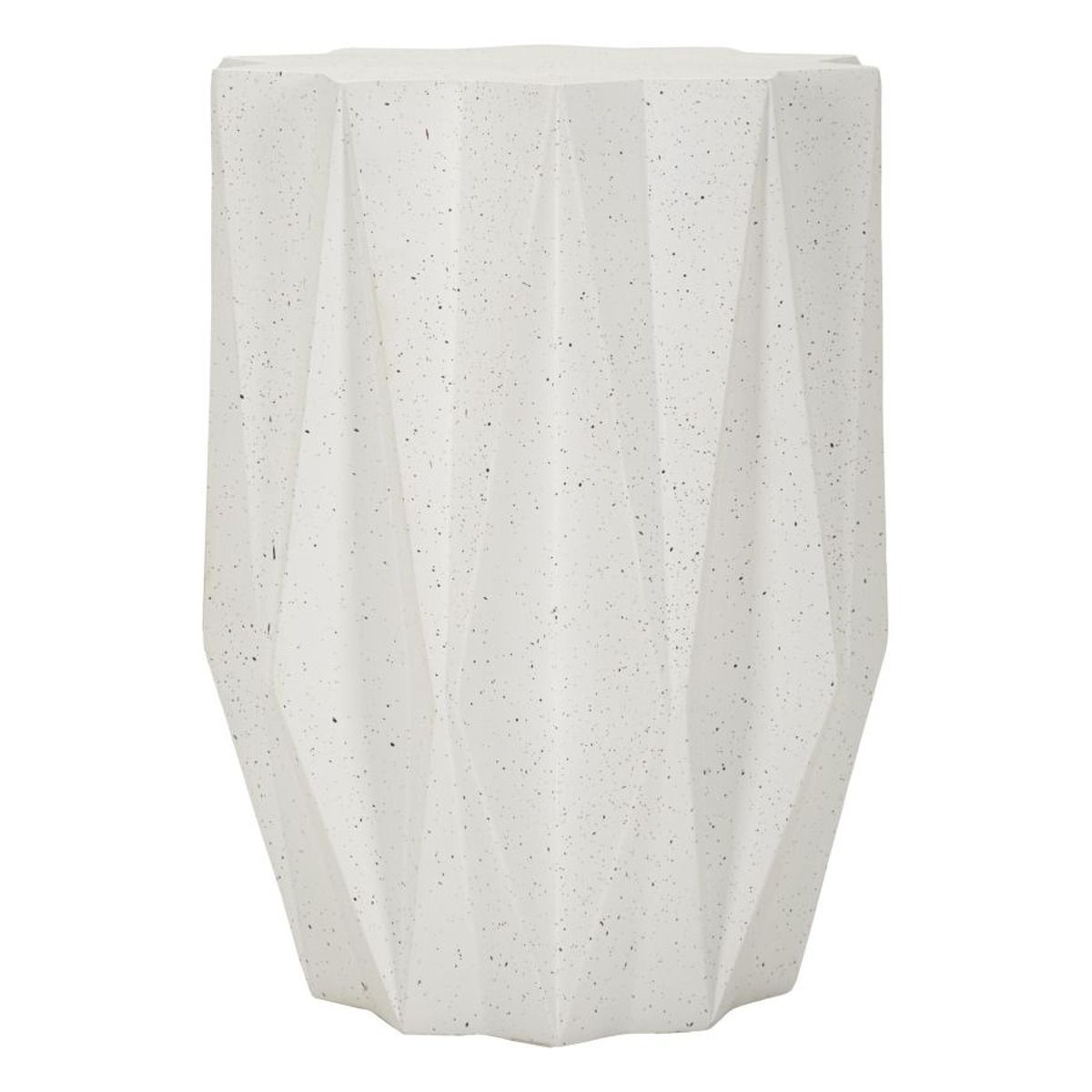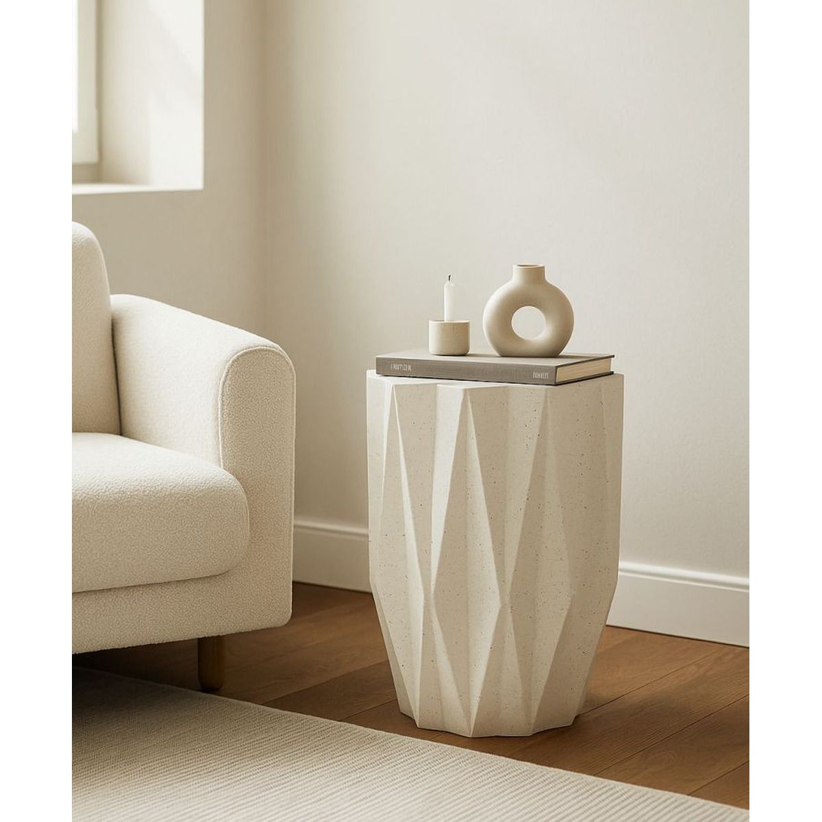 | Descrizione | Linee sfaccettate e geometrie eleganti definiscono questo tavolino. L'effetto pietra e la forma scultorea ne fanno un complemento raffinato e luminoso, ideale per interni moderni. |