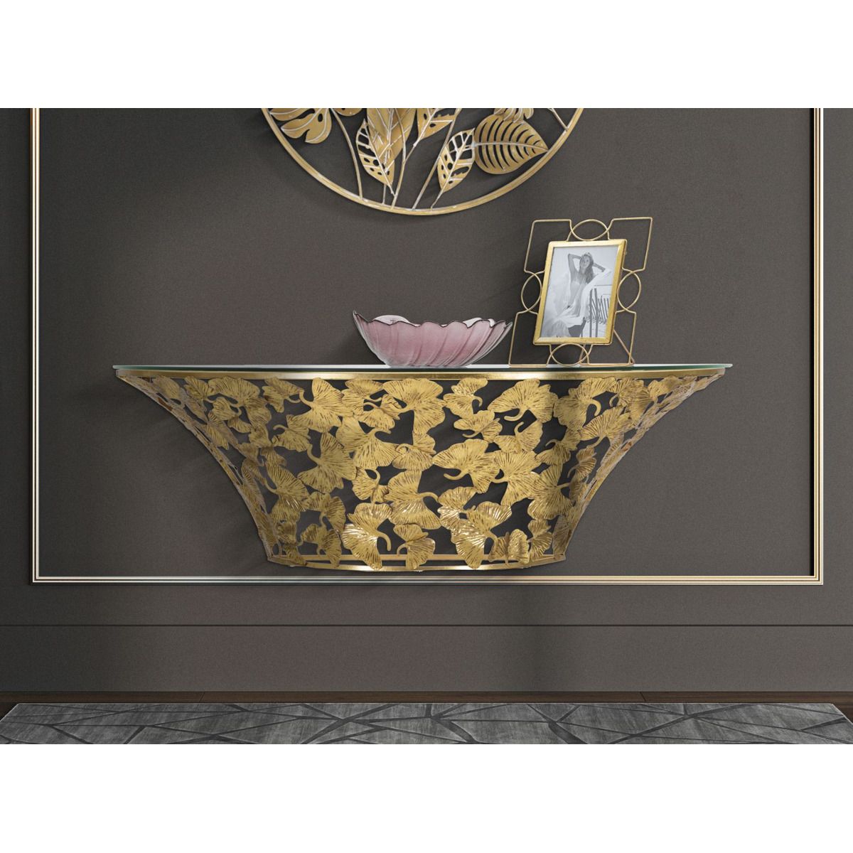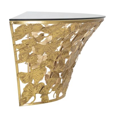 | Descrizione | Console semicircolare da parete in metallo dorato con piano in vetro. La base è riccamente decorata da foglie. Il particolare design dona un tocco di classe e relax ad ogni ambiente. |