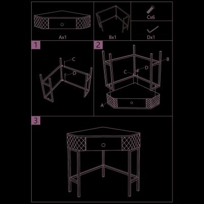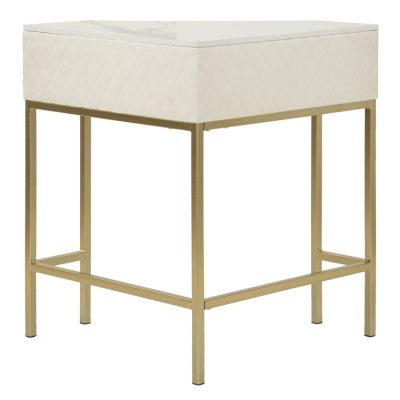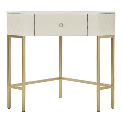 | Descrizione | Console ad angolo trapuntata in simil pelle con eleganti gambe dorate e poggiapiedi integrato. Pomello a forma di brillante per un tocco di lusso e stile. Completa di cassetto. Prodotto da assemblare. |