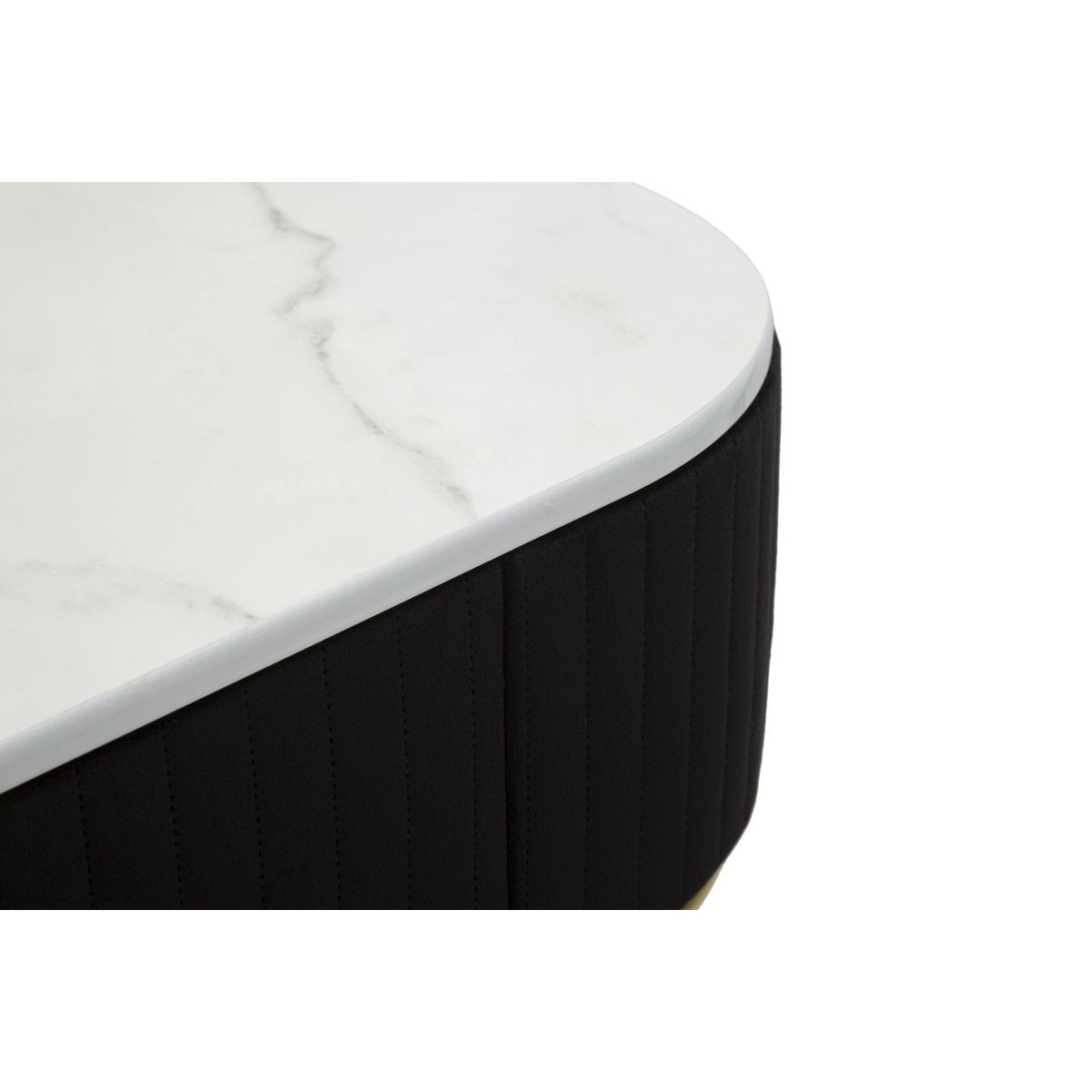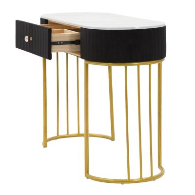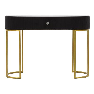 | Descrizione | Console rettangolare con i lati smussati con cassetto. La struttura in metallo dorato, la parte superiore rivestita in tessuto imbottito nero e il piano realizzato in simil marmo creano un elegante contrasto che può essere abbinato a qualsiasi tipologia di arredo. |