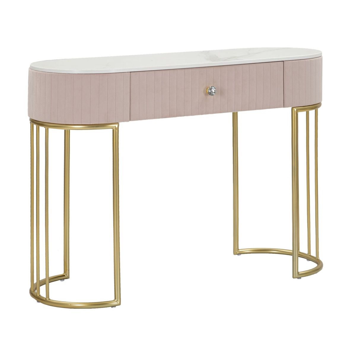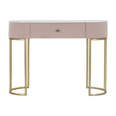 | Descrizione | Console rettangolare con i lati smussati con cassetto. La struttura in metallo dorato, la parte superiore rivestita in tessuto imbottito rosa e il piano realizzato in simil marmo creano un elegante combinazione che può essere abbinata a qualsiasi tipologia di arredo. |