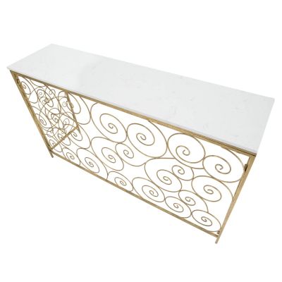 | Descrizione | Console rettangolare in metallo dorato impreziosita dal piano in marmo bianco. Le particolari e morbide decorazioni geometriche donano un tocco di ricercatezza ad ogni ambiente. |